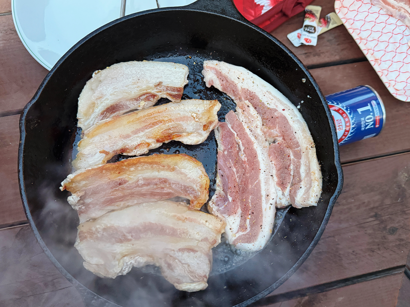 무의도 자연휴양림은 숯이나 장작 금지는 물론 실내와 베란다에서 고기를 구울 수 없는데요. 숙소 밖에 있는 나무테이블에서 휴대용 버너 사용이 가능합니다. 날씨가 조금 풀린 것 같아 야외 테이블에서 삼겹살을 구워 먹으려고 준비해 왔는데 저녁에 바람이 엄청 불었답니다. 이미 술을 마신 상태라 밖으로 나가서 다른 음식을 사 올 수도 없고 주변에 배달이 가능한 곳이 한 군데도 없어 어쩔 수 없이 버너 바람막이를 온몸으로 붙잡고 고기를 구웠는데요. 바닷가 근처여서 날씨가 시시각각 바뀌기 때문에 음식은 구워 먹는 것보다는 회나 조리되어 있는 걸 가져오는 것이 좋을 것 같습니다. 삼겹살은 어찌어찌 구워서 맛있게 먹었습니다 :-)