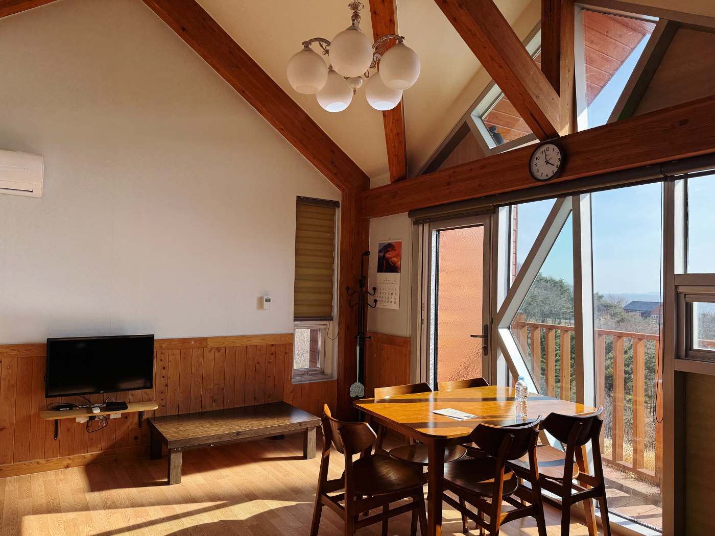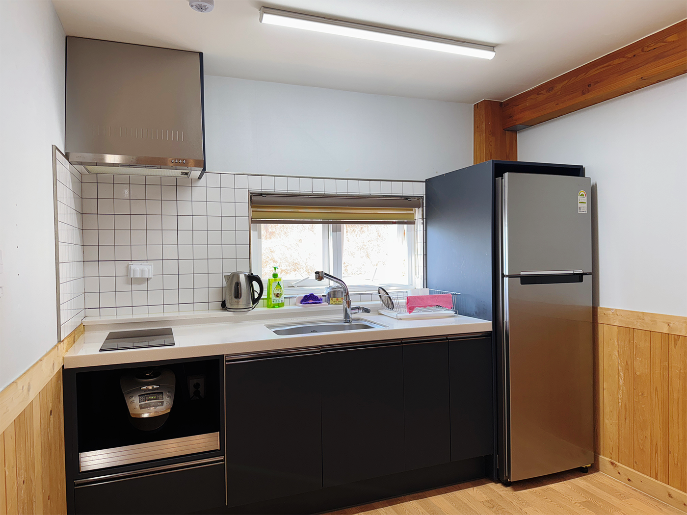 숲 속의 집은 거실 겸 방 1개와 화장실, 주방으로 이루어져 있습니다. 초지도는 정원이 5인이라 그릇이나 이불도 5인에 맞게 세팅되어 있었답니다. 주방에는 냄비, 프라이팬, 그릇, 가위, 칼, 집게, 세제, 전기밥솥, 전기포트 등 각종 용품들이 있습니다. 주방에는 뜨거운 물이 세게 잘 나왔는데요. 화장실은 물은 엄청 뜨거운데 수압이 약해 샤워할 때 조금 불편했답니다.