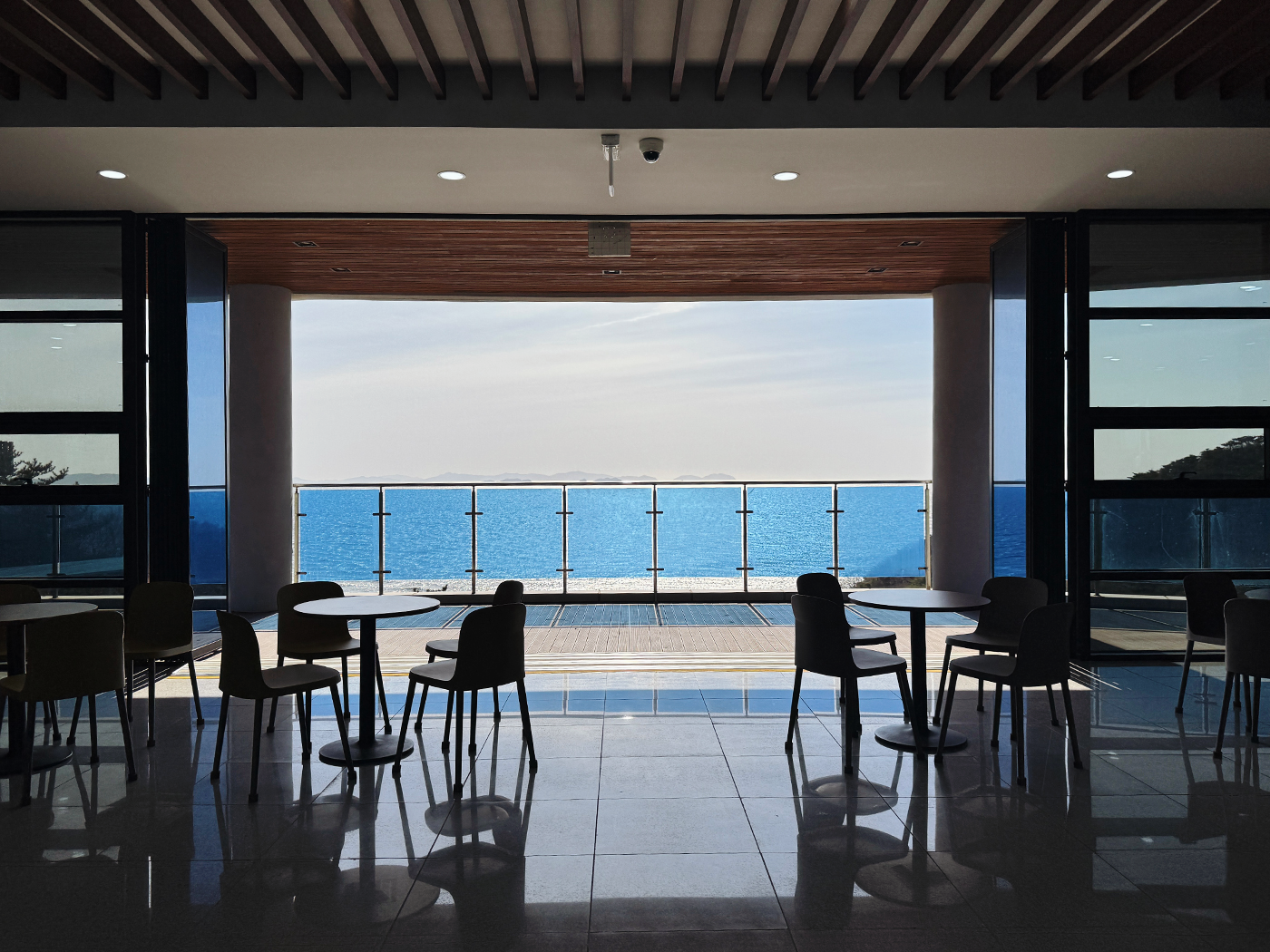 방문자센터에서 예약확인을 하고 카드키를 받으면 되는데요. 방문자센터 로비가 오션뷰 카페처럼 너어~무 멋지답니다. 방문자센터에는 편의점이나 매점은 따로 없고 공용전자레인지와 음료수 자판기가 있습니다.