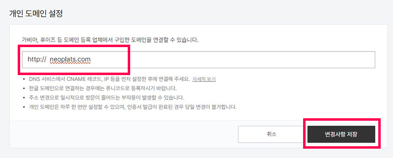 개인 도메인 설정에서 도메인 연결하기를 눌러 도메인을 입력하고 저장하면 됩니다~