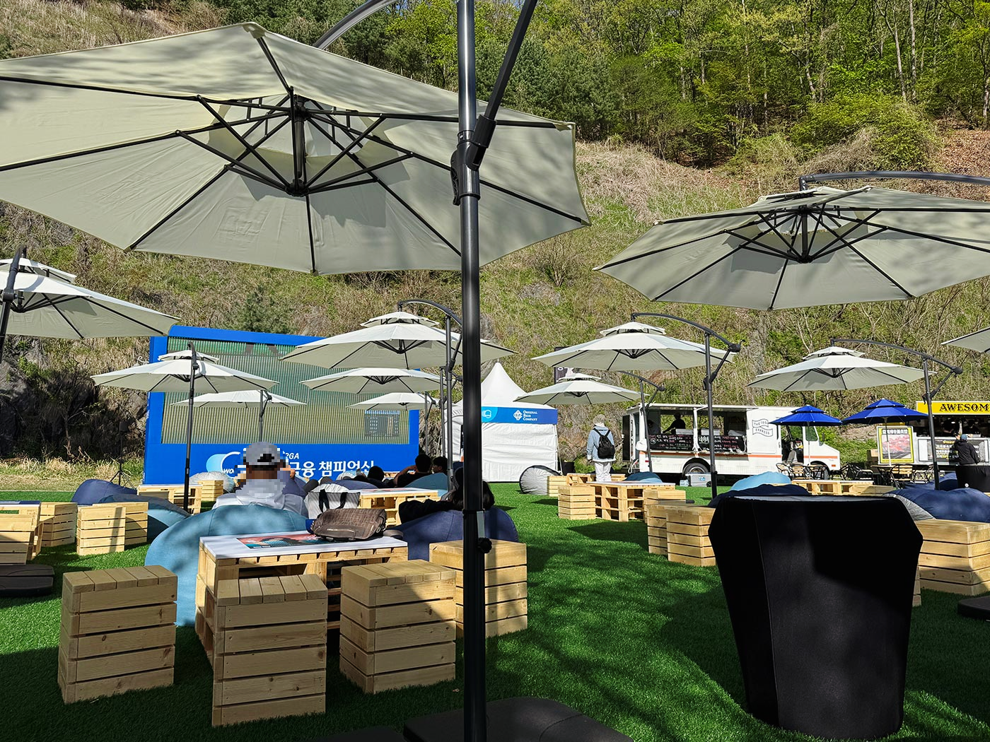 이벤트 행사장을 지나면 F&B존이 있습니다. 스시와 버거를 파는 푸드트럭도 있고 맥주, 커피를 파는 곳도 있어서 편하게 앉아서 쉴 수 있는 공간인데요. 큰 화면으로 중계되는 경기도 볼 수 있고 테이블과 의자들이 많아 좋았답니다.