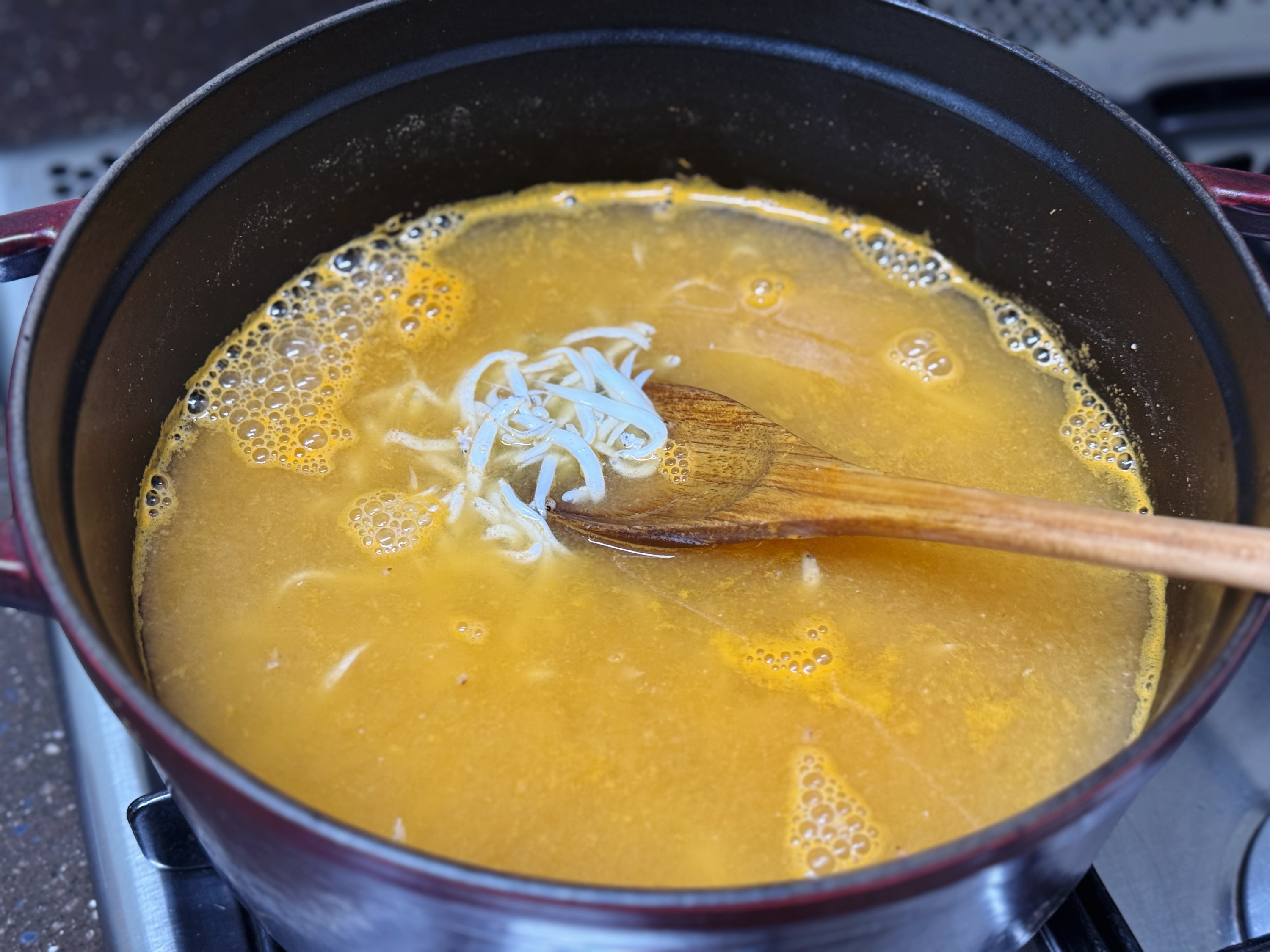 물에 된장을 풀고 끓으면 실치를 넣어주세요. 실치가 국에 우러나기 때문에 따로 멸치를 넣거나 코인육수를 사용하지 않아도 됩니다.