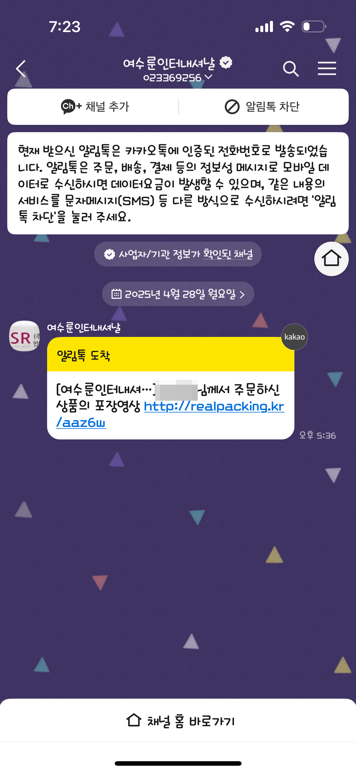 굳이 포장 영상까지 보내 줄 필요는 없는데.. 업체만의 고객 경험 차별화 전략인가 싶습니다. 여수룬인터내셔날에서 온 카톡메시지는 피싱메시지가 아니니 안심하셔도 될 것 같아요~ 그래도 혹시 모르니 모르는 곳에서 온 메시지는 항상 조심하세요 :-)