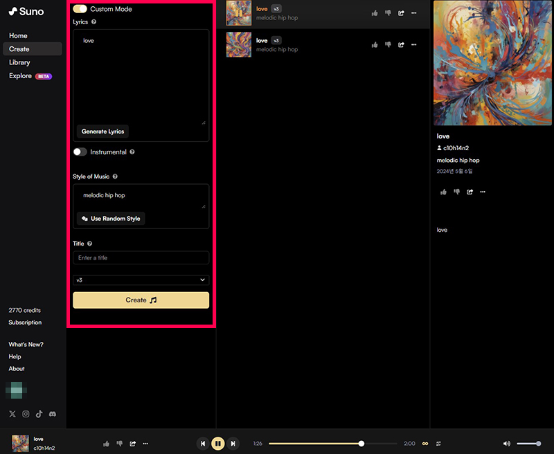 기본 모드에서 "사랑에 대한 노래 만들어줘"라고 입력해서 1곡, 커스텀 모드에서 가사에 love만 넣고 랜덤스타일 중 melodic hip hop으로 1곡을 만들어 총 2곡을 만들어 봤습니다~