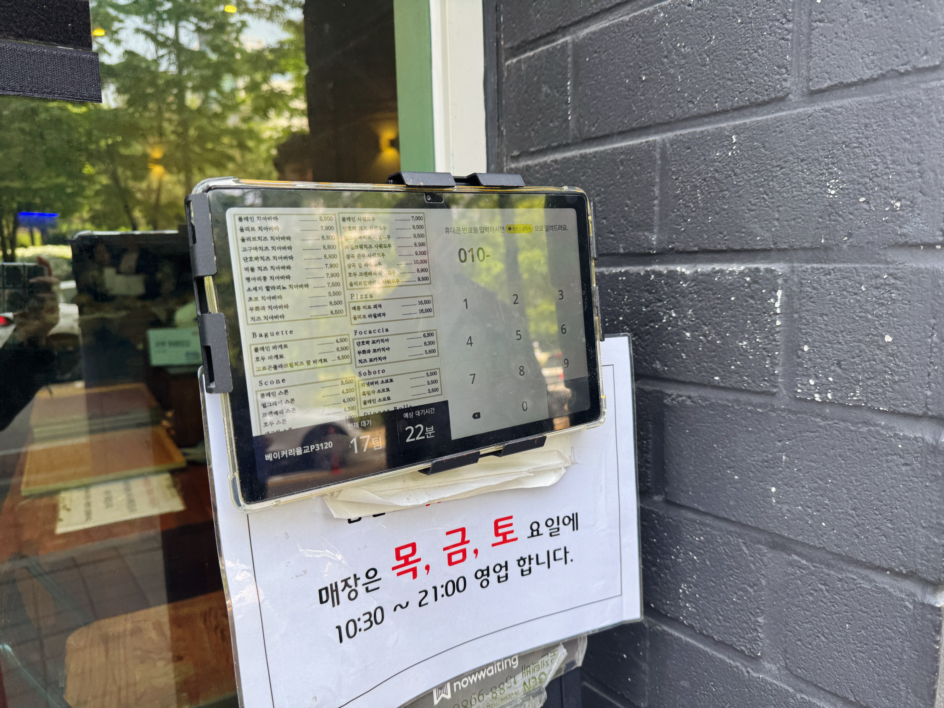 매장 입구에 대기를 등록할 수 있는 태블릿이 있습니다. 빵 구매, 매장 이용 구별 없이 무조건 대기예약을 해야 한답니다. 평일 12시쯤 방문해서 그런지 매장 앞에 사람들이 많지 않았는데.. 17팀이 대기 중이고 예상 대기시간은 22분이었답니다.