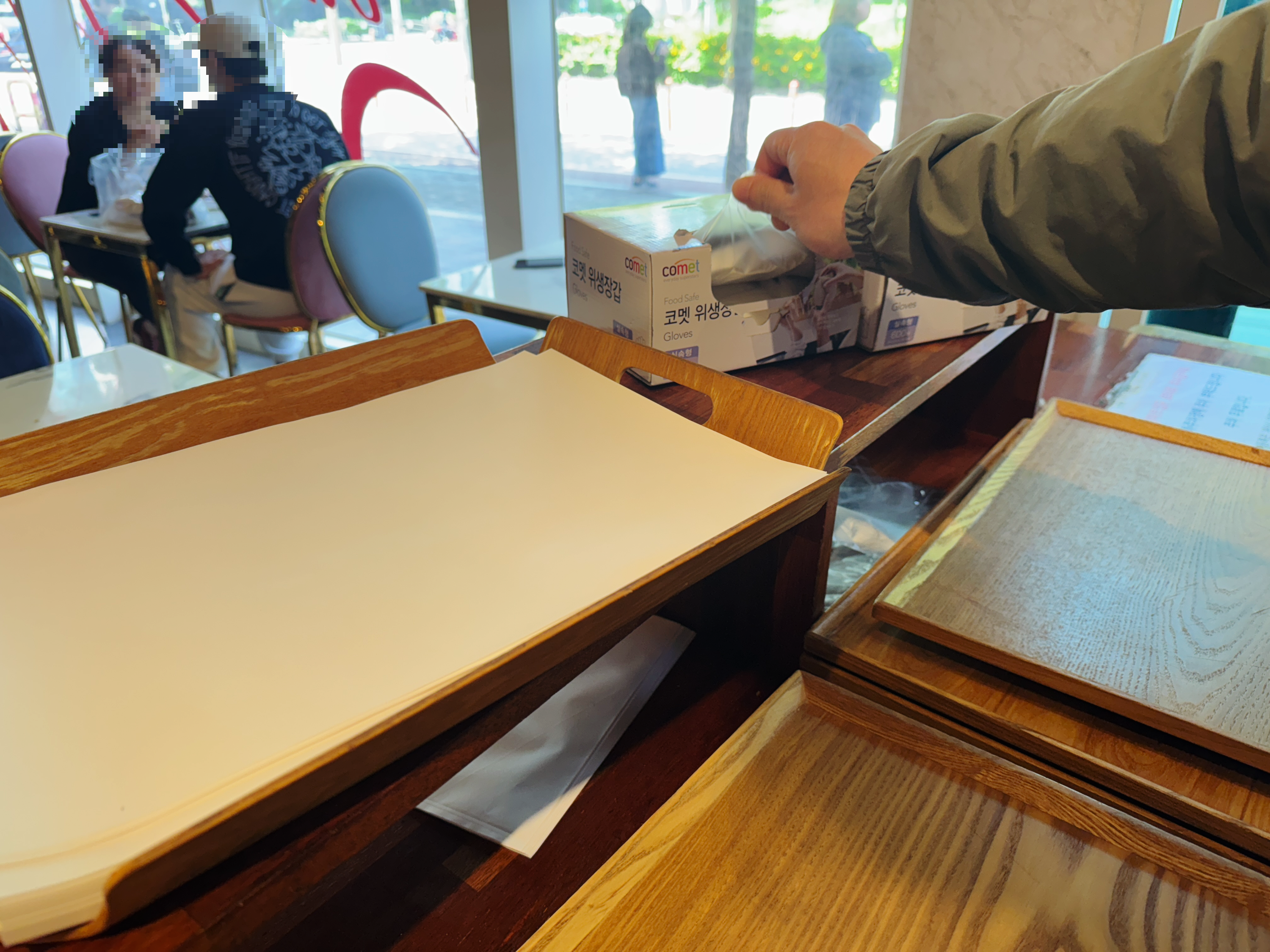 매장에 들어가면 쟁반 위에 종이를 깔고 위생장갑을 껴야 하는데요. 집게가 없답니다. 왜냐하면... 빵들이 도저히 집게로 집을 수 없는 무게이기 때문인데요. 이것이 바로 베이커리율교가 유명한 이유입니다. 재료를 아끼지 않고 빵에 듬뿍듬뿍 내용물이 가득 차 있어 무게가 엄청 무겁답니다. 일반 빵 생각하시면 아니~아니 됩니다.