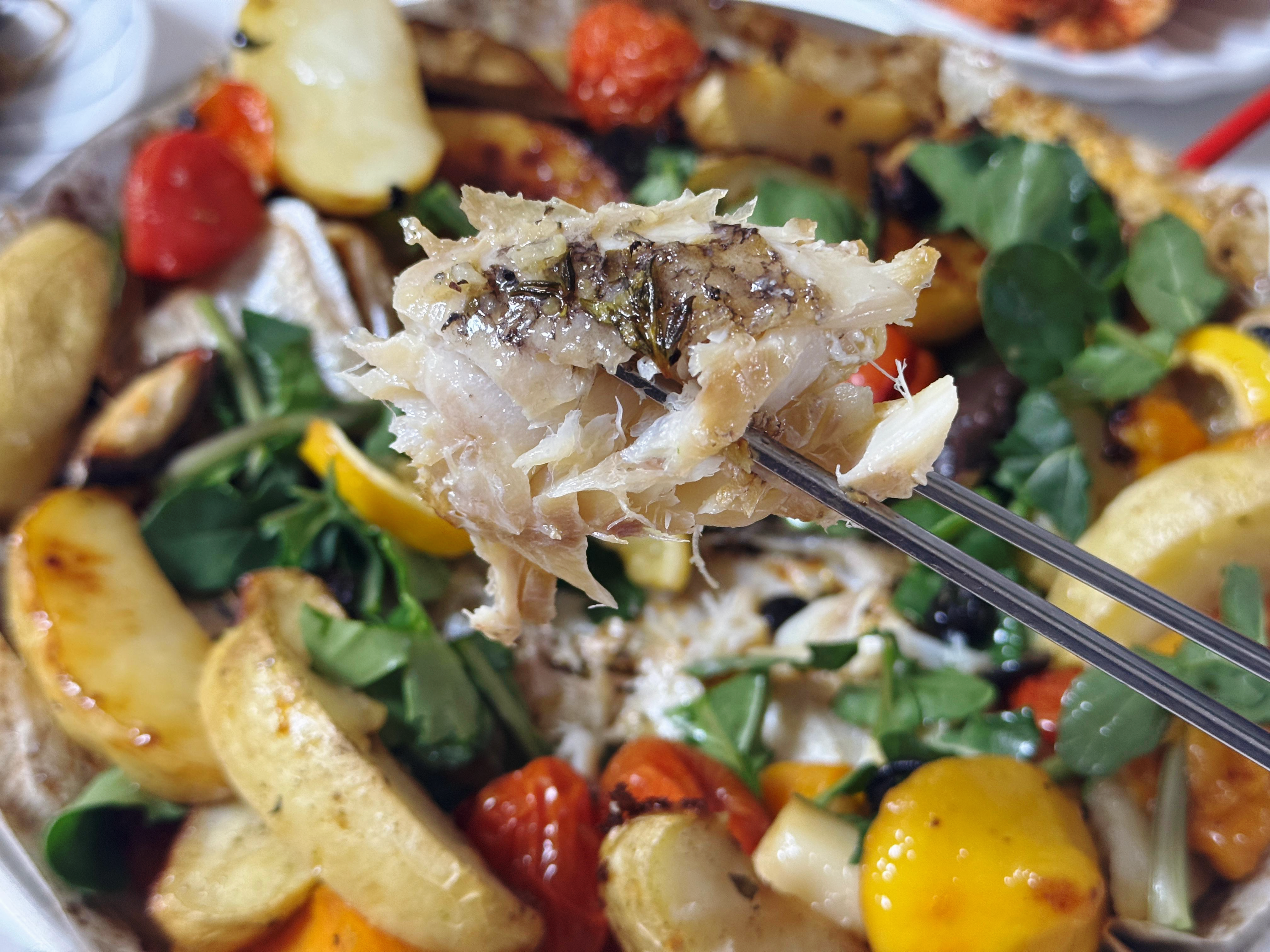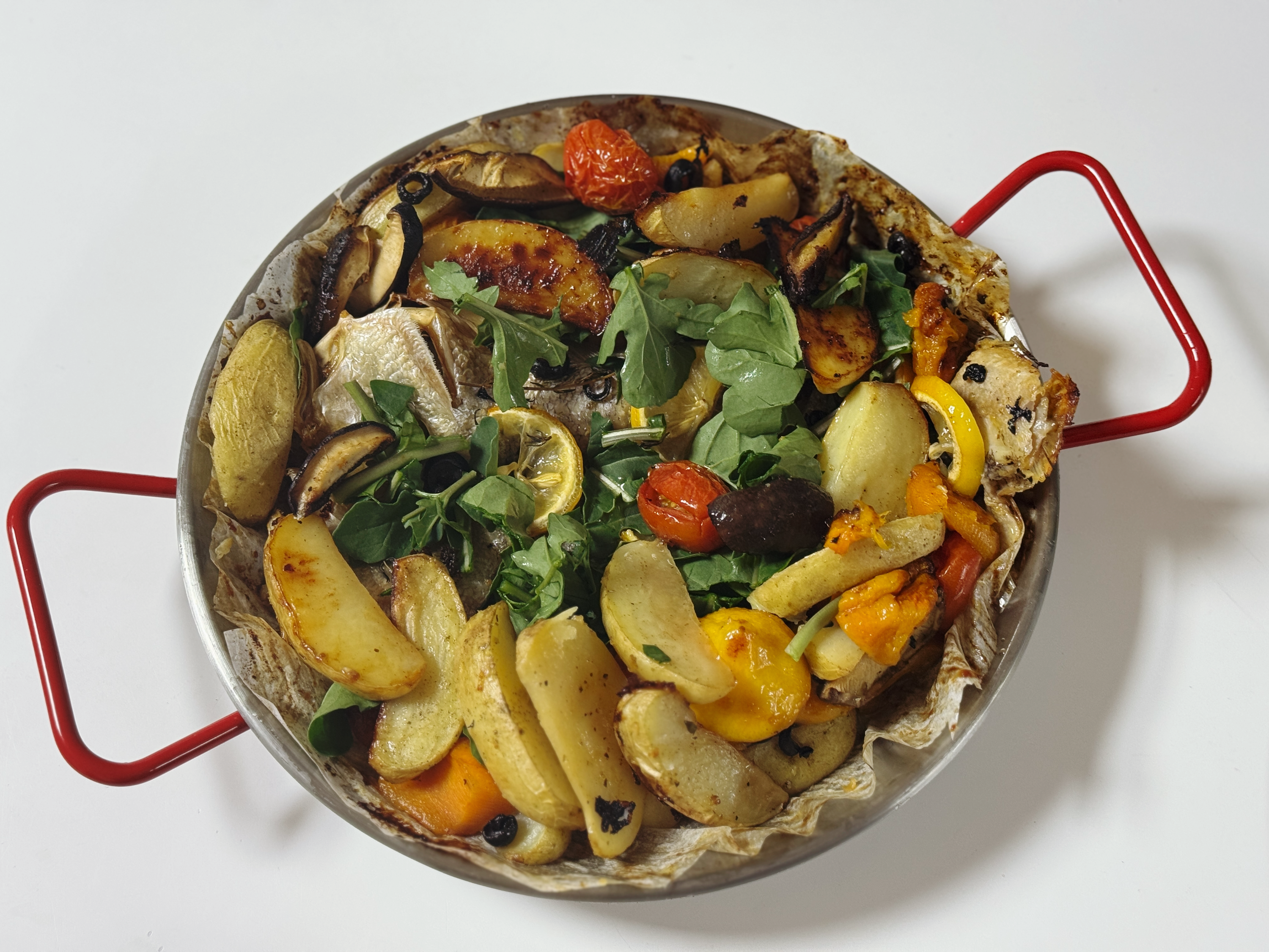 접시에 옮겨 담으려고 하니 옥돔이 부서질 것 같아 종이호일 그대로 빠에야냄비에 옮겨 담고 종이호일을 동그랗게 잘라줬습니다. 빠에야냄비가 조금 작아 옥돔이 아래에 깔려서 잘 안 보이네요 :-)