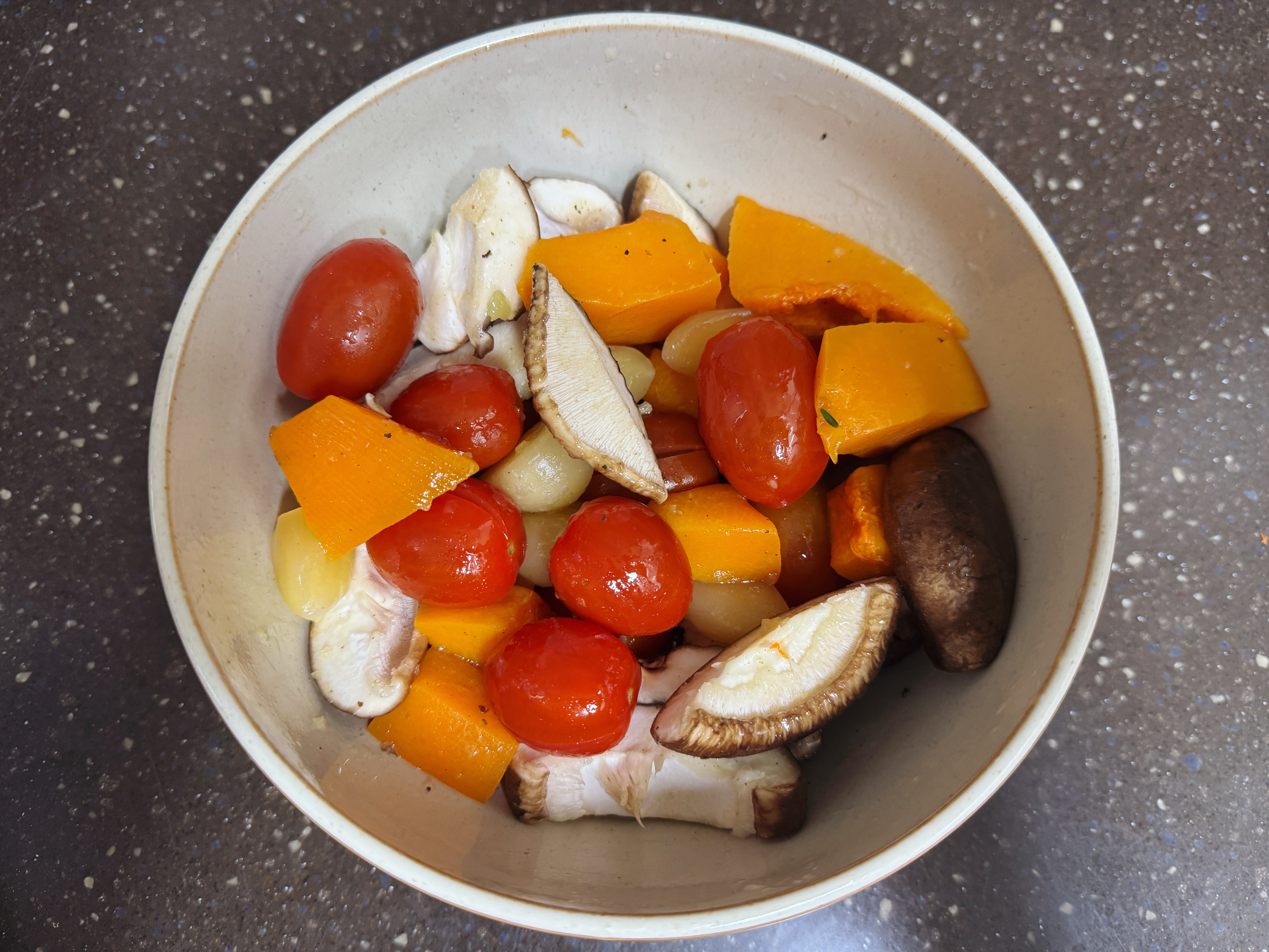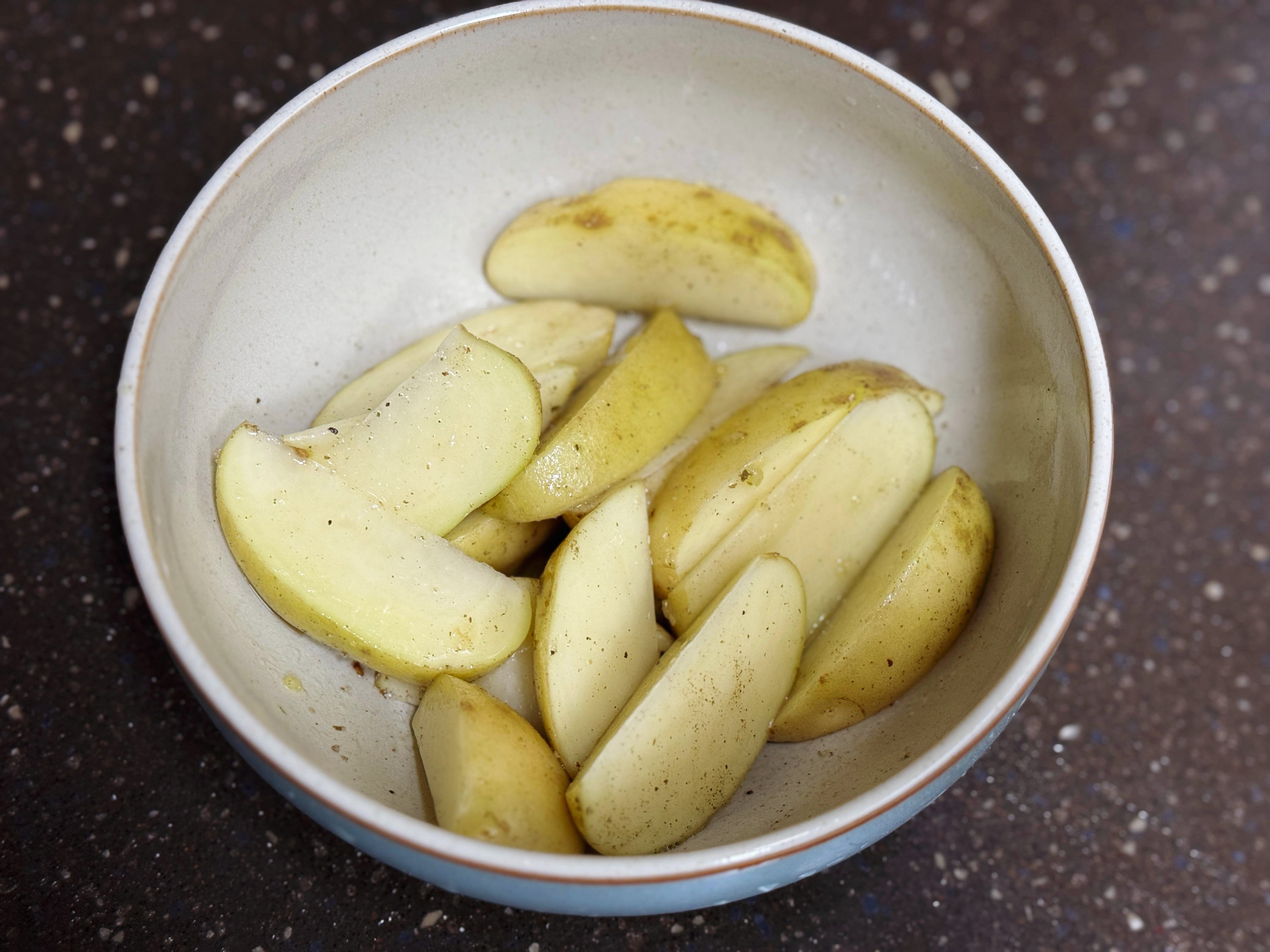 생선구이에 곁들일 야채를 손질해 주세요. 오븐에 구우면 맛있는 감자와 방울토마토, 마늘을 넣고 집에 있던 호박과 표고버섯도 적당한 크기로 잘라서 준비했습니다. 야채에도 올리브 오일과 소금, 후추를 적당하게 뿌려주세요.