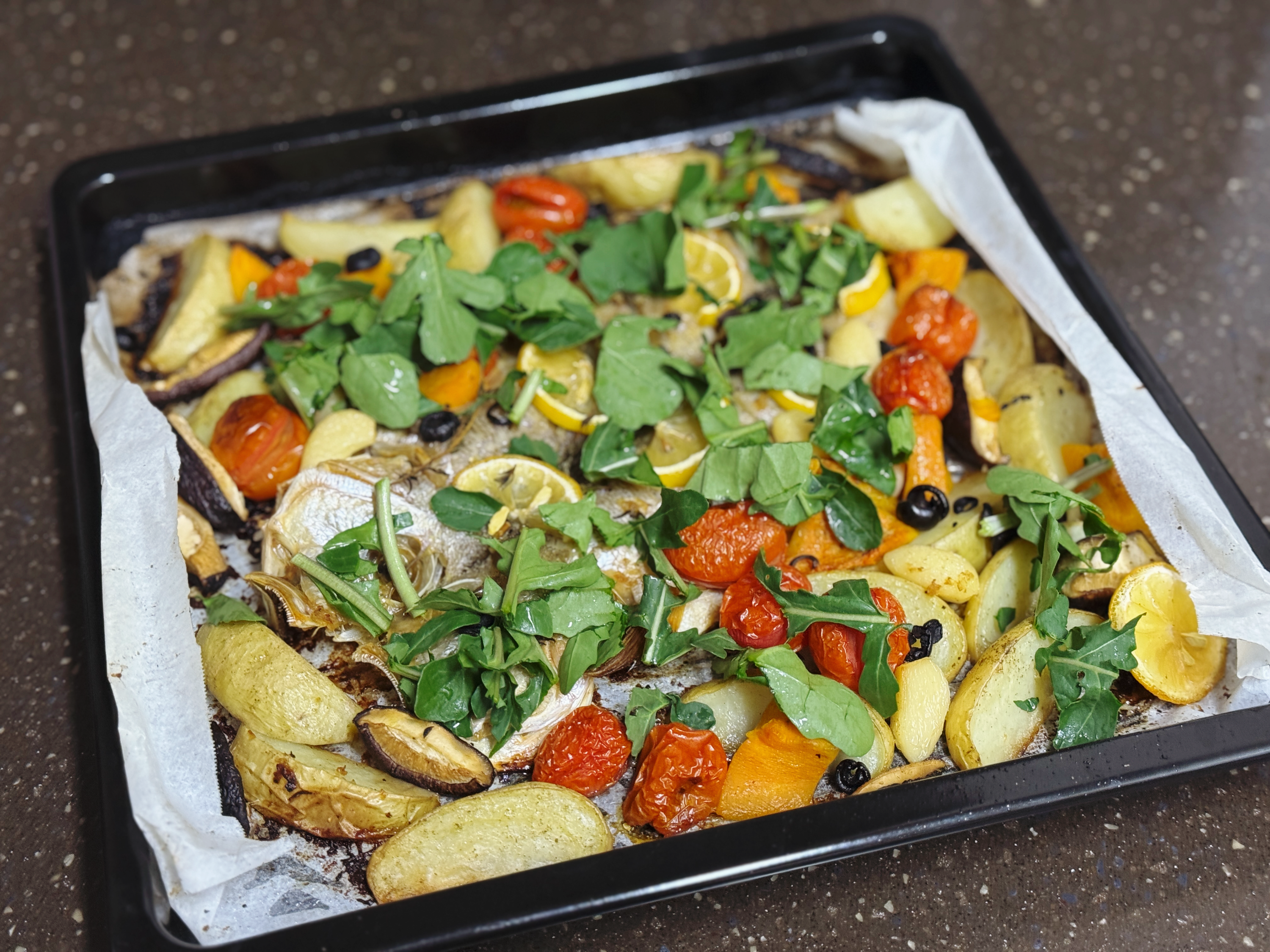 오븐팬에 종이호일을 깔고 옥돔을 가운데 올려주세요. 옥돔 위에 남아있던 레몬 반개를 슬라이스 해서 올리고 야채들도 팬에 올려주세요. 모든 재료를 다 올린 후 종이호일을 뚜껑처럼 덮어 재료들이 타지 않도록 해주세요.