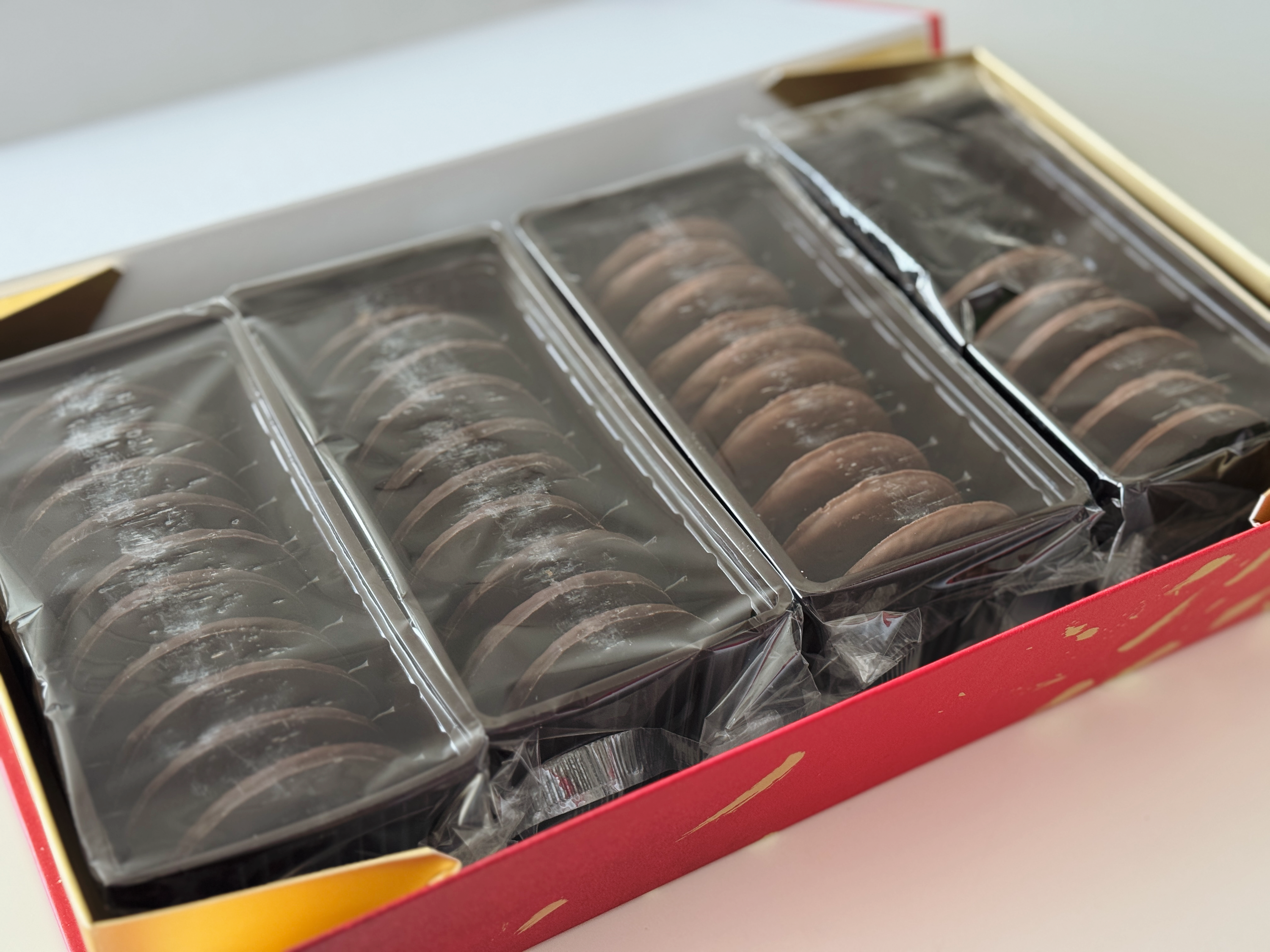 오잉? 이것이 무엇이죠? 고급진 박스와는 달리 초콜릿쿠키들은 아주 실용적으로 포장되어 있습니다 >. <