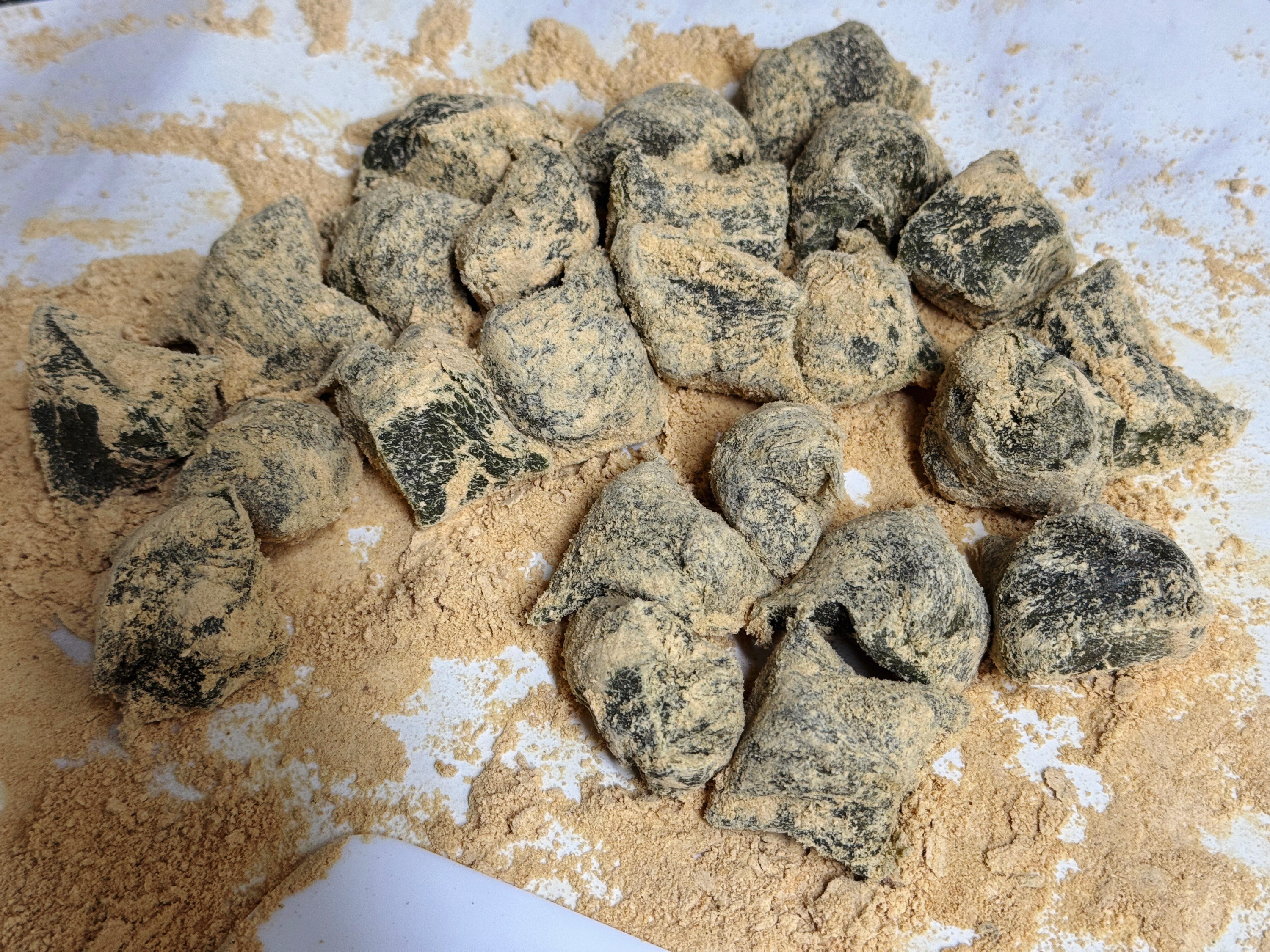 콩고물을 골고루 묻혀가면서 쑥떡을 잘라주세요. 먼저 세로로 길게 자른 후 가로로 하나씩 잘라주면 됩니다. 떡은 칼보다는 빵 반죽할 때 사용하는 스크래퍼로 자르면 잘 잘린답니다.