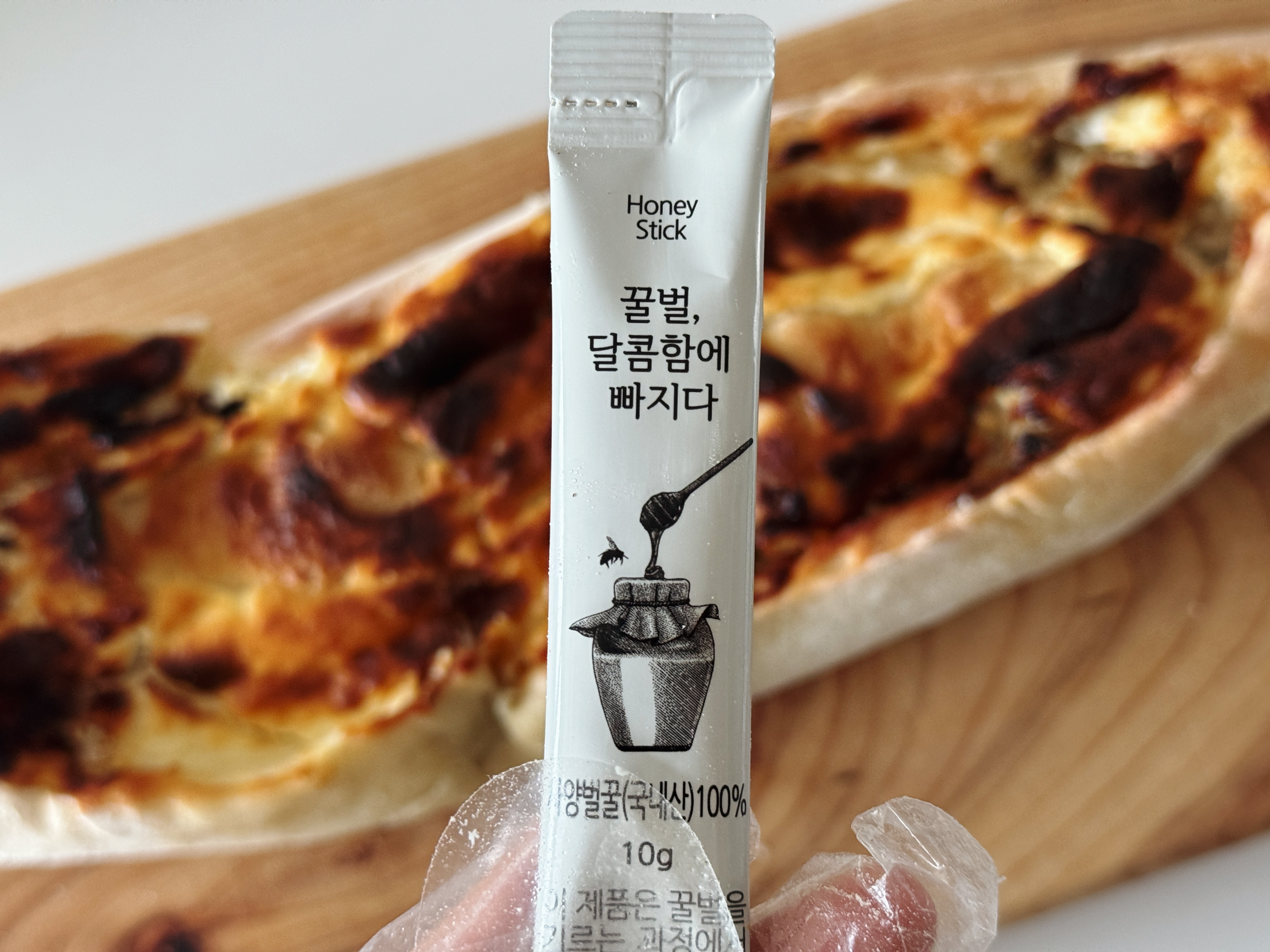 고르곤졸라크림치즈꿀바게트는 크기가 커서 도마 위에 올리니 빵이 밖으로 튀어갑니다. 봉지에 꿀도 같이 들어있었는데요. 모르고 바게트와 같이 썰 뻔했답니다.