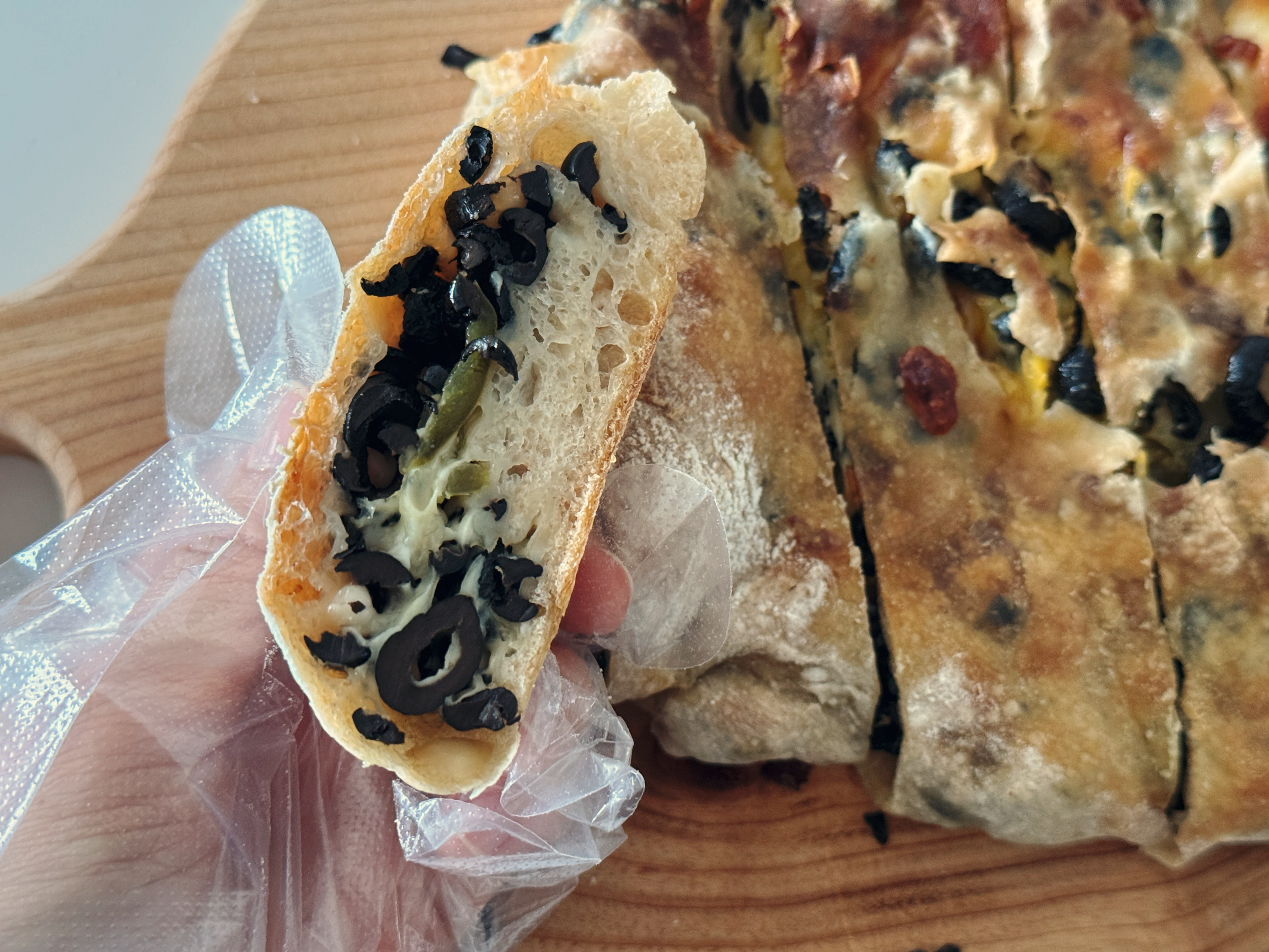 올리브 할라피뇨 사워도우입니다. 저번에 방문했을 땐 없어서 못 먹었었는데요. 이번엔 빵이 나오고 있길래 담아왔답니다.