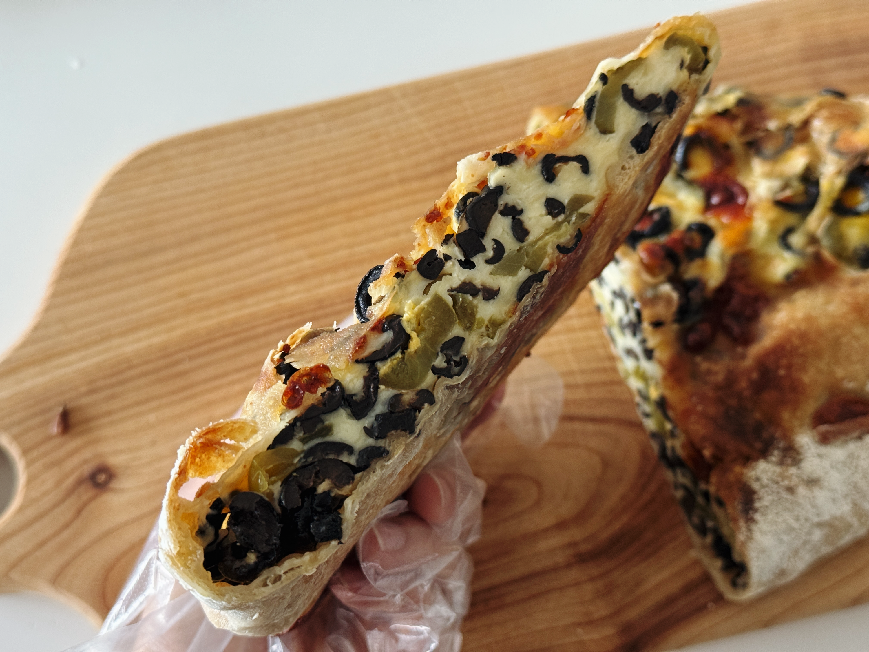 반으로 자르면 역시나.. 치즈와 올리브, 할라피뇨가 한가득입니다.