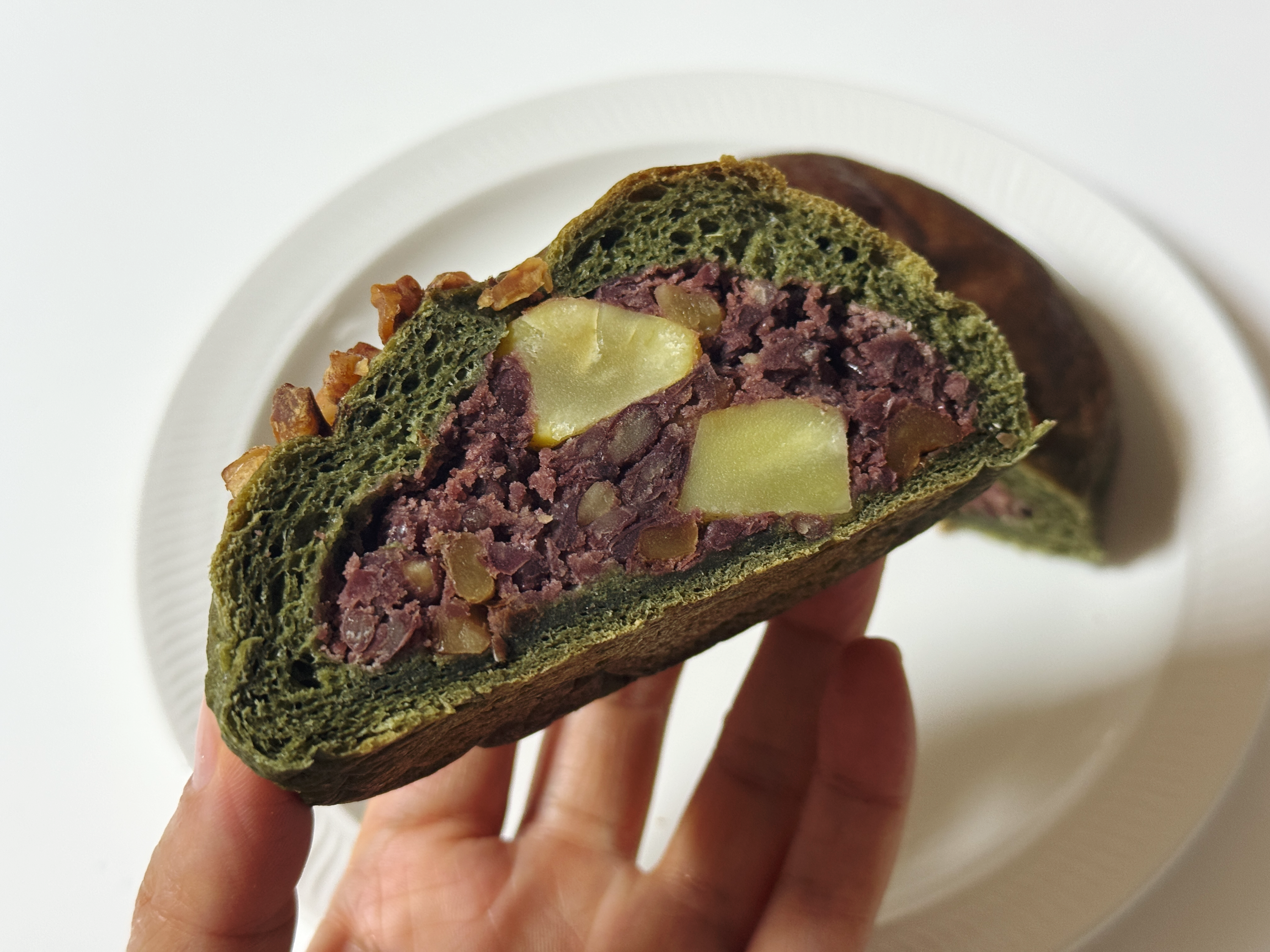 마지막으로 별 기대 없이 쑥빵이라서 담아 온 쑥쌀팥빵입니다. 큰 기대 없이 담아왔는데.. 이 쑥빵마저도 속이 꽉 차 있었답니다. 은은한 쑥향과 속은 팥, 호두, 밤이 같이 섞여있어 팥을 좋아하지 않는 저도 뿅~하고 반했답니다.