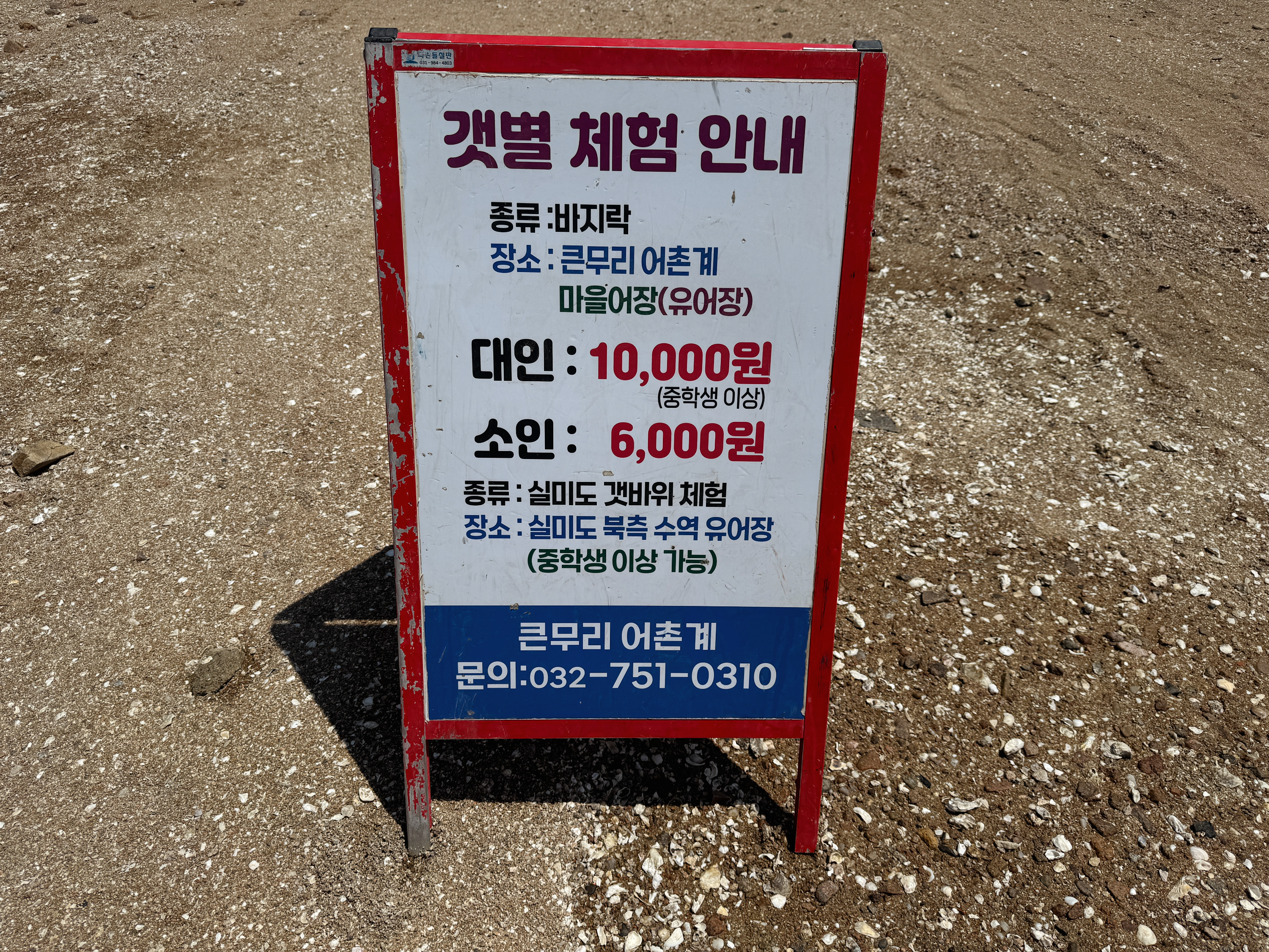 갈라진 바닷길을 건너서 실미도를 한 바퀴 돌고 갯벌체험도 하려고 했었는데.. 너무 늦게 도착하는 바람에 실미도 들어갔다 오기와 갯벌체험 두 가지 중에 하나를 선택해야 했는데요. 실미도는 다음에 다시 와서 여유 있게 돌아보기로 하고 바지락 캐기 갯벌체험을 했답니다. 갯벌체험 매표소는 실미도로 들어가는 바닷길과 가까운 곳에 있습니다. 갯벌체험 매표소에서 체험비를 결제하면 플라스틱 바구니와 호미, 빨간 조끼를 준답니다. 빨간 조끼를 입고 호미로 열심히 바지락을 캐서 바구니에 담으면 됩니다 :-) 조개 캐기는 실미도로 들어가는 길 갯벌의 줄 안쪽에서 하면 됩니다. 물이 들어올 시간이 가까워져서 그런지 멀리 가지 말고 해변 가까운 곳에서 캐라고 하시면서 멀리 안 나가도 바지락이 많이 잡힌다고 알려주셨어요.