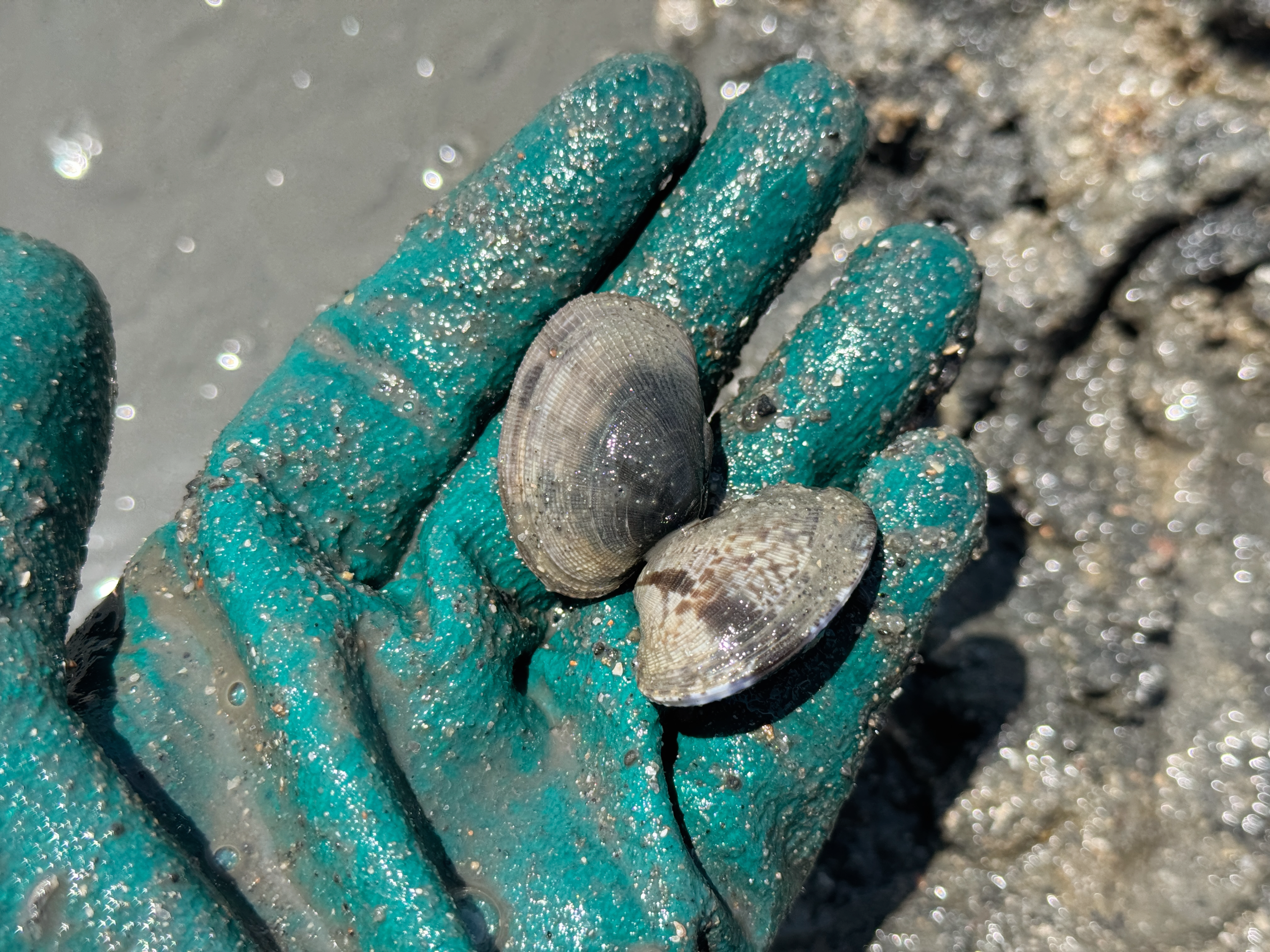 12시 반부터 바지락을 캐기 시작했는데요. 1시 반까지 한 시간 동안 열심히 갯벌에서 호미질을 했답니다. 호미로 갯벌을 파면 바지락이 갯벌과 같이 뭉쳐져서 나오기 때문에 잘 보이지 않는데요. 바지락이 안 보인다고 실망하지 말고 손으로 흙덩이를 살살 만져보면 파낸 흙 속에 바지락이 들어 있답니다~ 저는 집에 있던 목장갑을 가져왔는데 손으로 조개를 집으려면 두꺼운 목장갑보다는 라텍스 장갑처럼 두께가 조금 있는 손에 밀착되는 장갑이 더 좋을 것 같습니다.