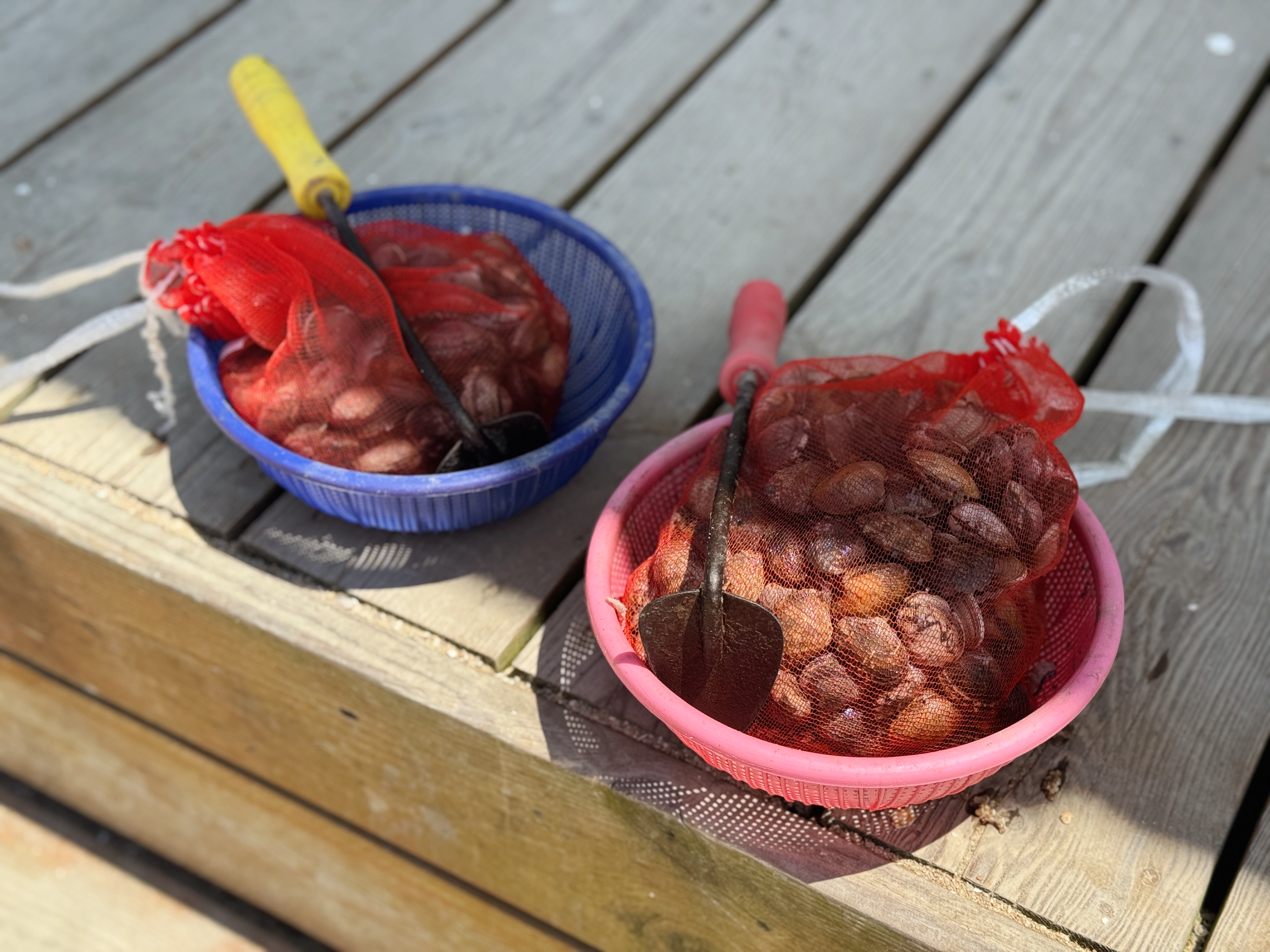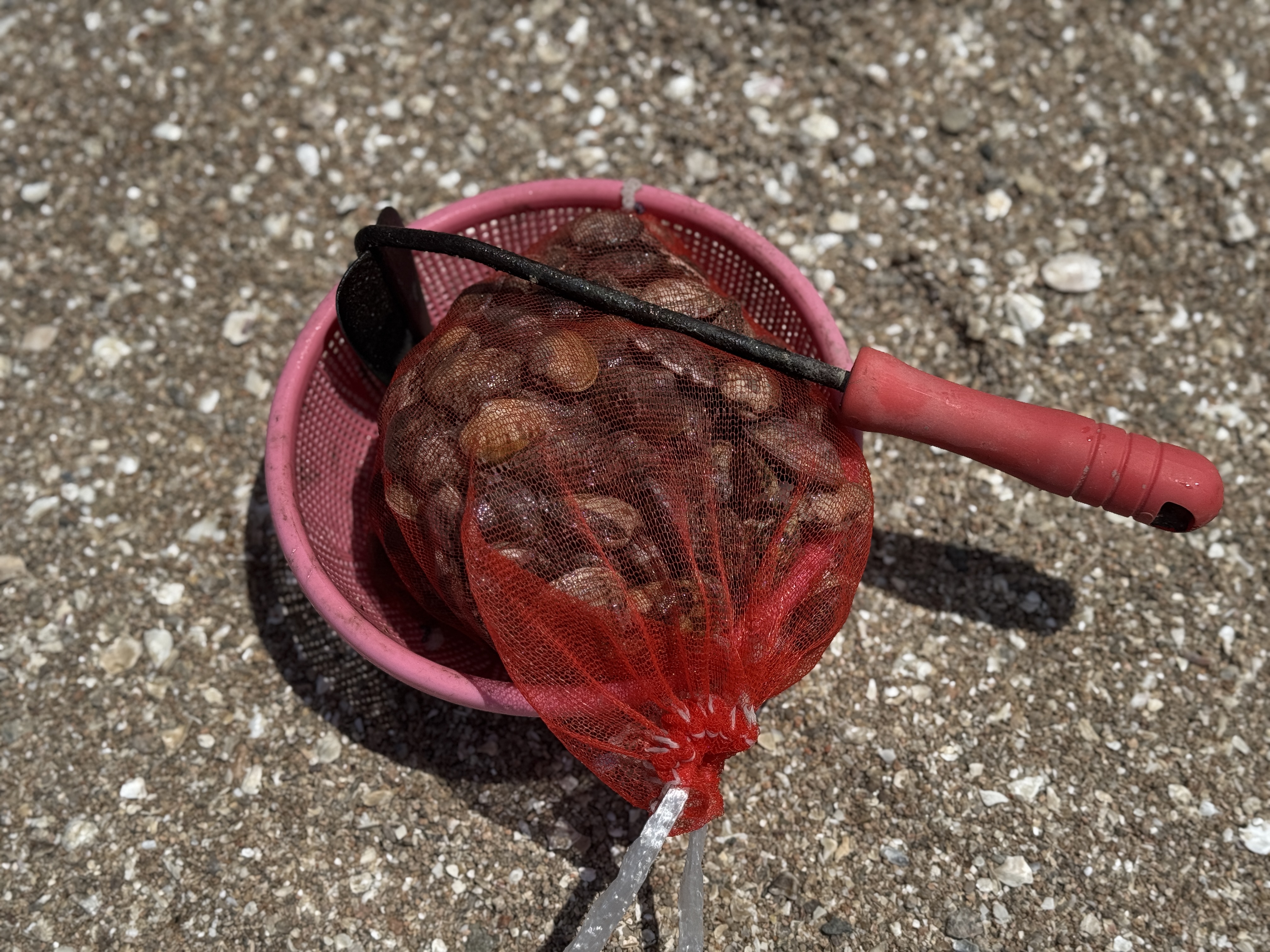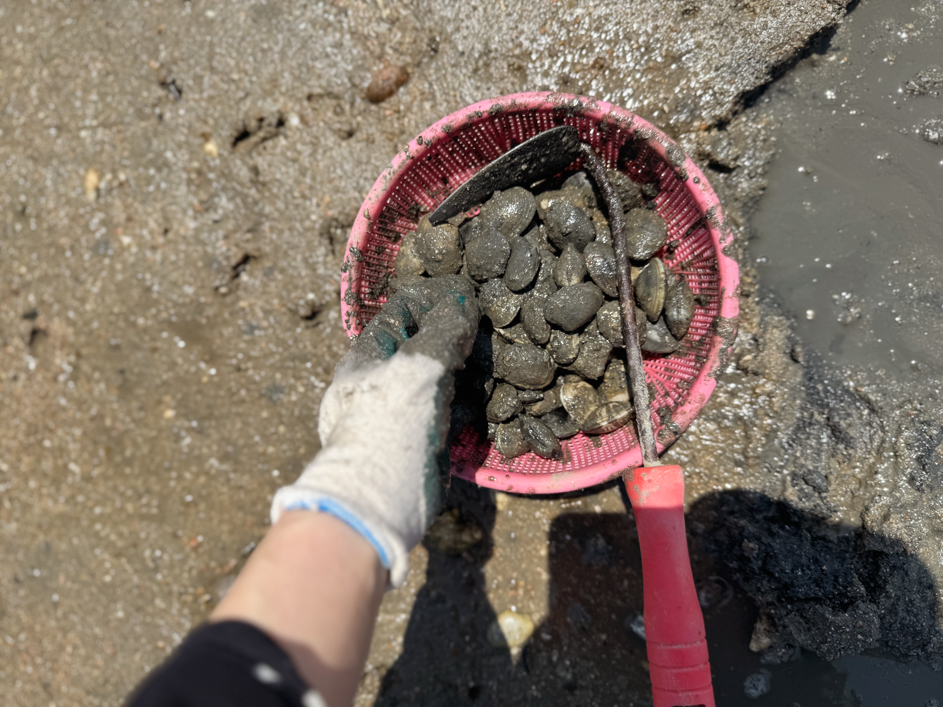 모래사장과 가까운 곳인데도 생각보다 바지락이 많았는데요. 한 시간쯤 쪼그려 앉아 바지락을 캐다 보니 다리와 허리가 너무 아팠답니다. 오래 캐실 분들은 목욕탕 의자나 간이 접이식 의자를 챙겨 오시면 조금은 편하게 바지락을 캘 수 있을 것 같아요~