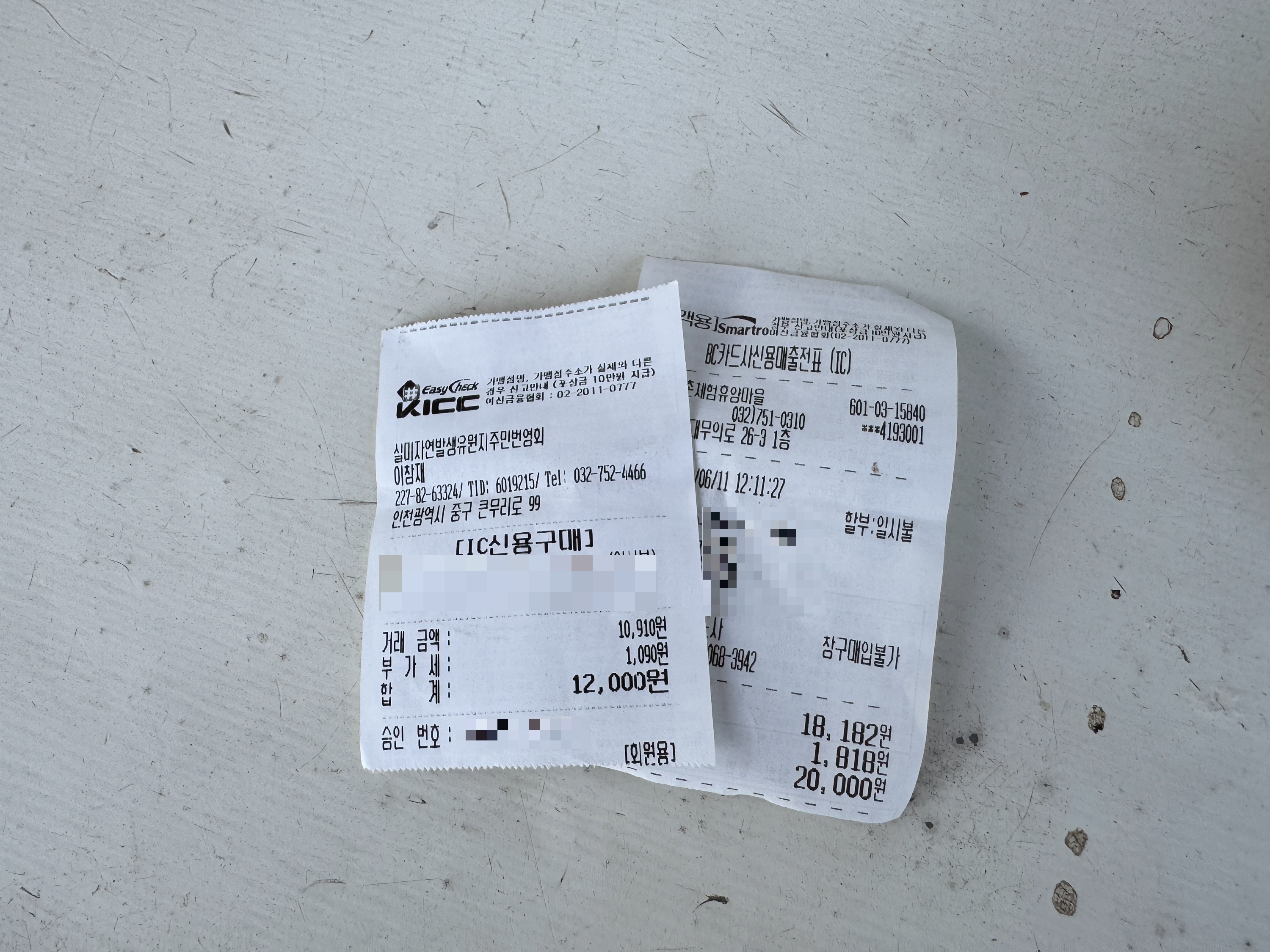실미도 유원지 입구에서 받은 입장료 영수증을 갯벌체험 매표소에 보여주면 영수증 뒤에 스탬프를 찍고 숫자를 적어 주신답니다. 집으로 돌아갈 때 유원지 입구 매표소 직원분께 갯벌체험 결제 영수증과 입장료 영수증을 같이 전달하면 입장료와 주차비 7,000원을 환불해 준답니다. 저희는 당일 캠핑까지 12,000원을 카드로 결제했는데요. 12,000원은 결제 취소되고 당일 캠핑비 5,000원만 재결제됐습니다. 갯벌체험으로 바지락도 득템하고 입장료는 다시 돌려받으니 왠지 기분이 좋았답니다 :-) 갯벌체험 하실 분들은 입장료 영수증 잘 챙겨서 잊지 말고 환불받으세요~