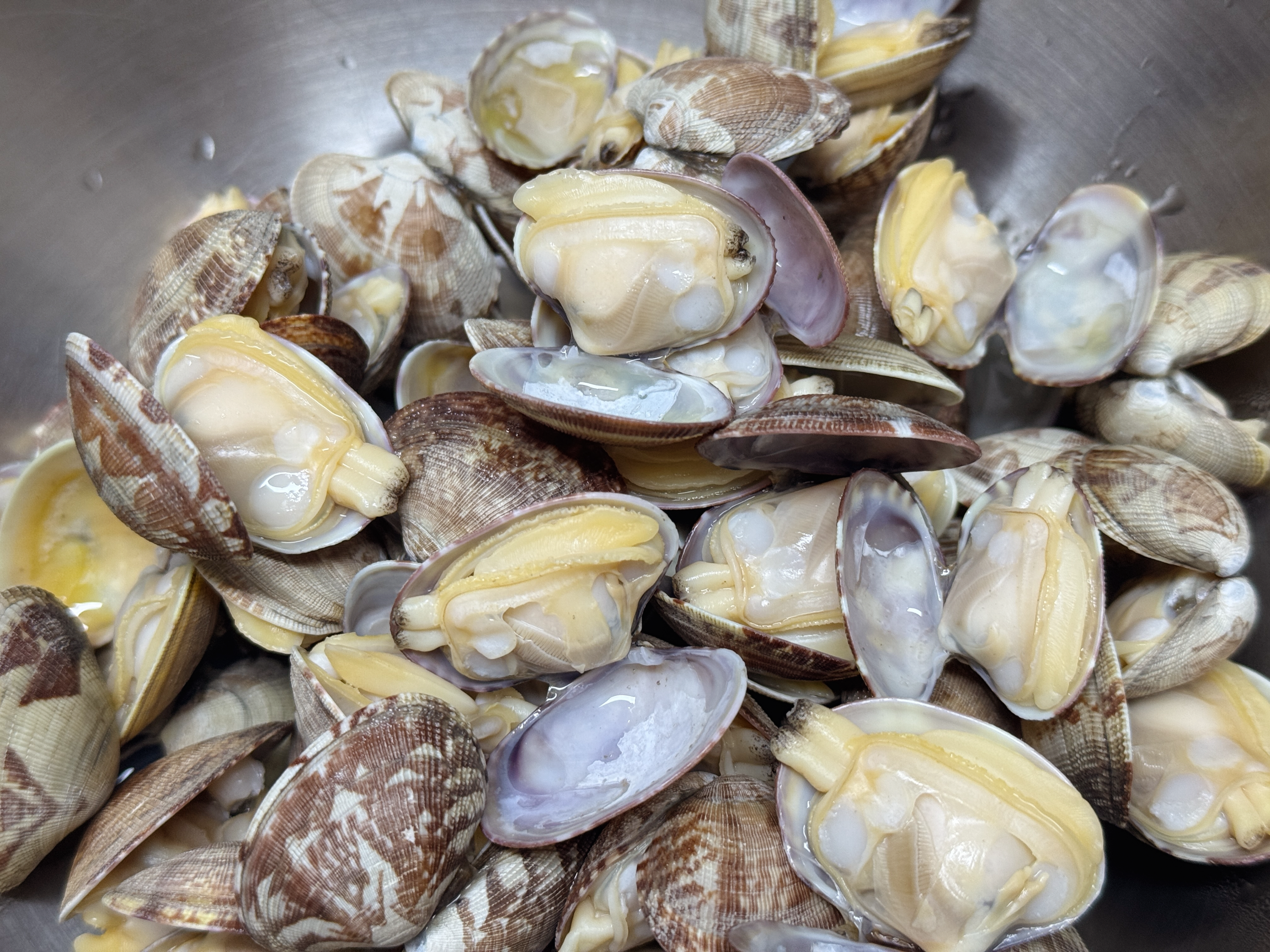 갯벌에서 캐 온 바지락은 흙이 많이 씹힐 거 같아 소금물에 담가서 하루 꼬박~ 조금 오래 해감을 했는데요. 갓 잡아 온 바지락이어서 그런지 하루가 지났는데도 물을 마구 뿜으면서 싱싱했습니다. 바지락은 해감이 잘 되어서 모래가 거의 씹히지 않았고 크기는 좀 작은데 속은 꽉 차 있어 쪼그려 앉아서 캔 보람이 있었답니다.