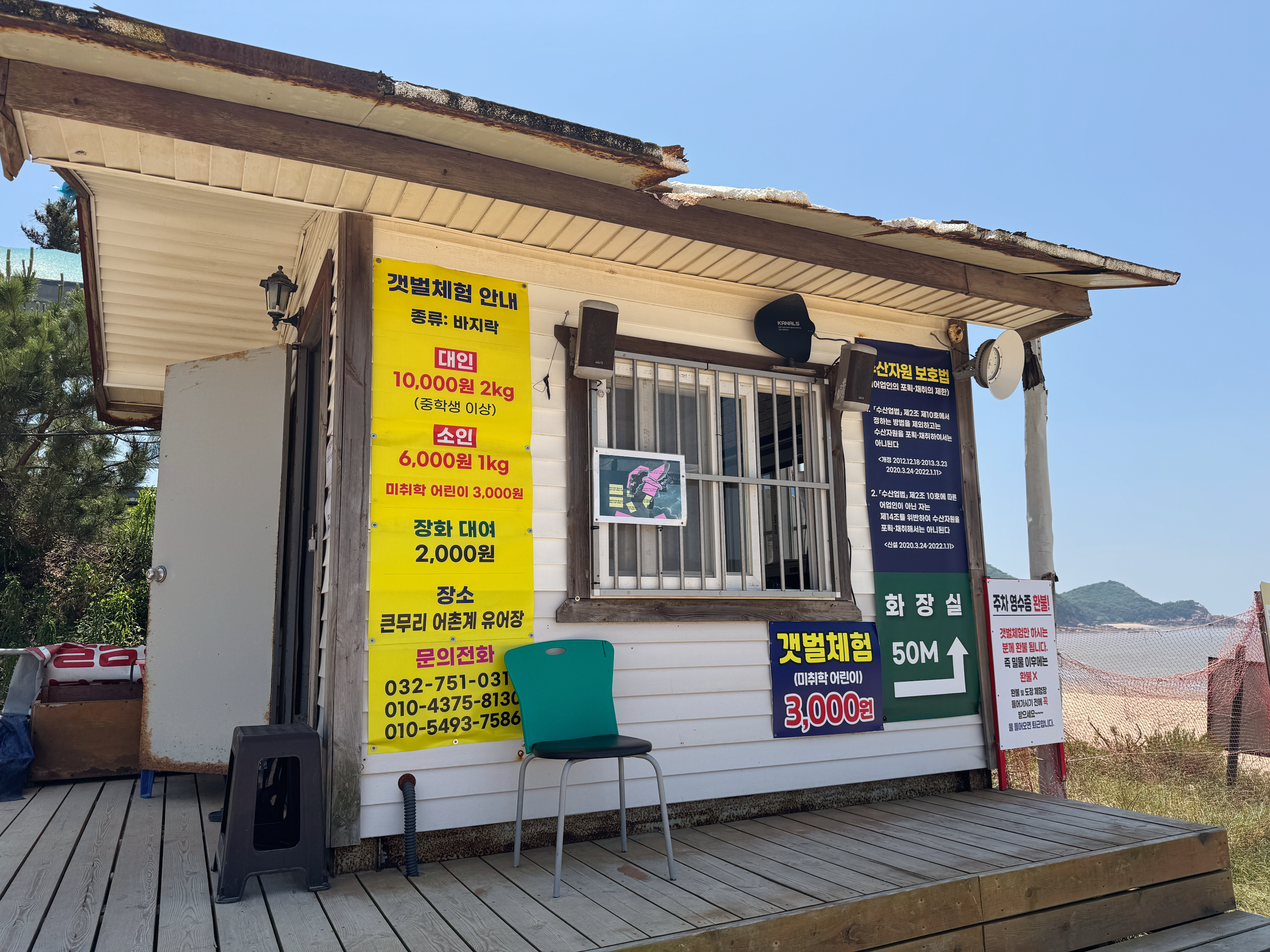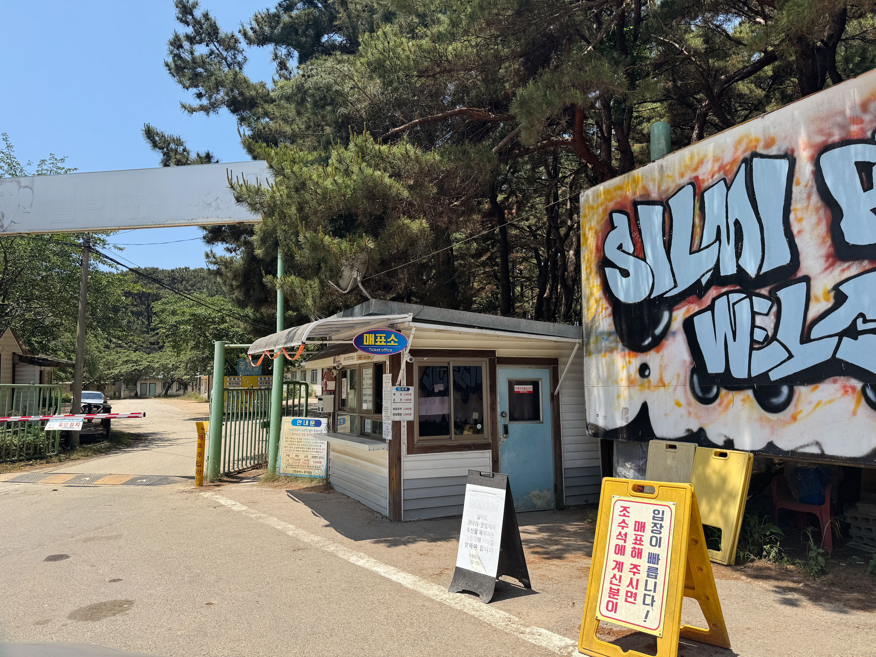 무의도대교를 건너서 오른쪽 산을 넘어 꼬불꼬불 산 길을 넘어가면 실미도 유원지가 나오는데요. 매표소에서 입장료를 결제하고 들어가면 됩니다. 입장료와 주차, 캠핑이 헷갈려서 그런지 매표소 창문 옆에 2인 기준 입장 7,000원, 2인 기준 당일 캠핑 12,000원, 2인 기준 1박 2일 20,000원, 1박 추가 시 8,000원이라고 안내되어 있답니다. 매표소에서 대인 2명 입장료 4000원, 당일 주차 3,000원, 당일 캠핑 5,000원 총 12,000원을 결제하고 들어갔습니다. 갯벌체험 시 입장료와 주차비 환불이 가능하니 영수증은 꼭 잘 챙기세요~