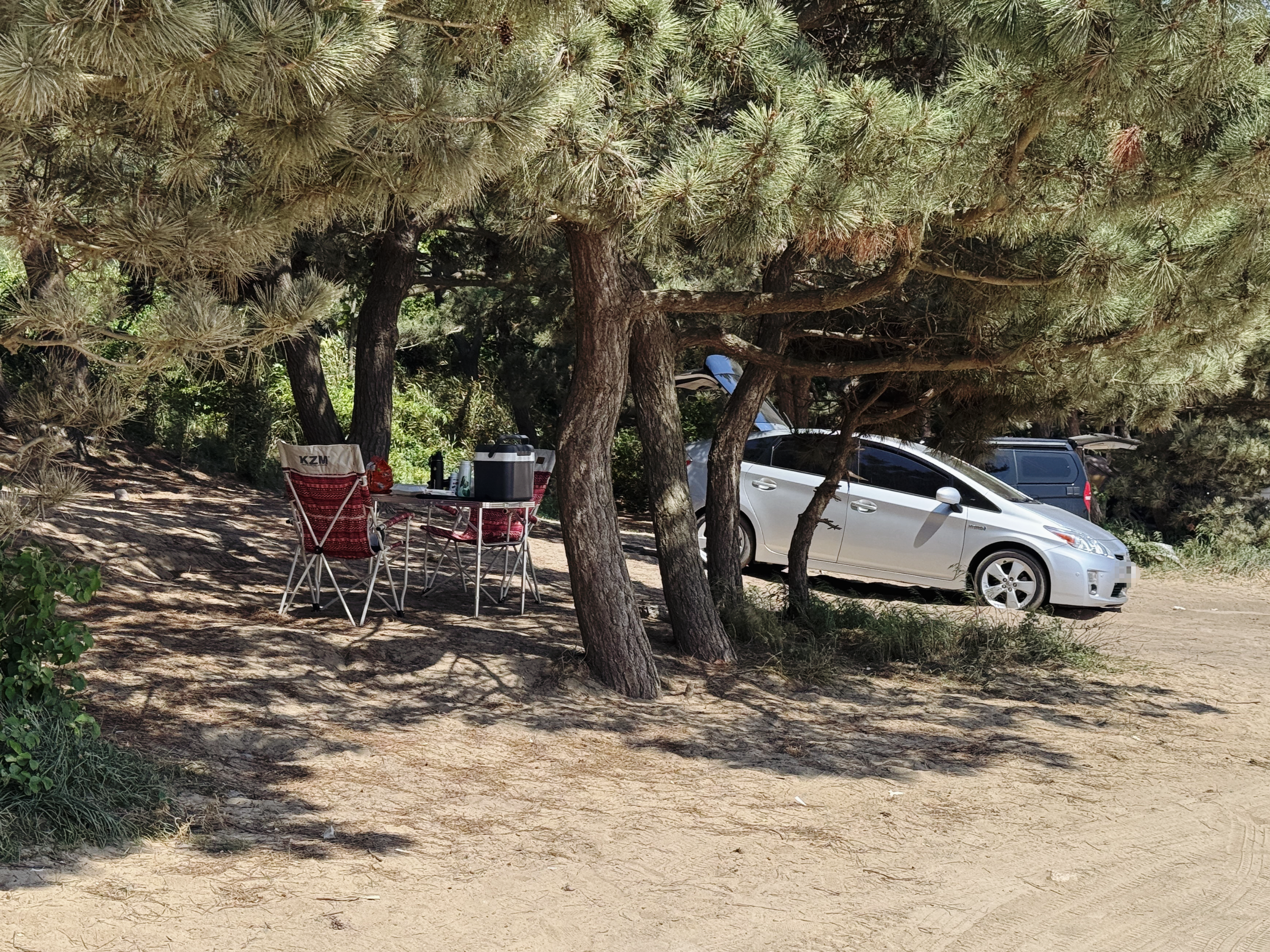 짝꿍과 저는 갯벌체험을 하기 위해 갯벌체험장과 가까운 곳에 자리를 잡았답니다. 매표소를 지나 양쪽으로 나뉘는 길에서 왼쪽 주차장 쪽으로 들어오면 바닷길이 열리는 곳 근처, 해변 왼쪽 구역이 나옵니다. 이쪽은 상대적으로 사람들이 적고 한적해 여유롭게 차크닉을 즐기기에 좋습니다.