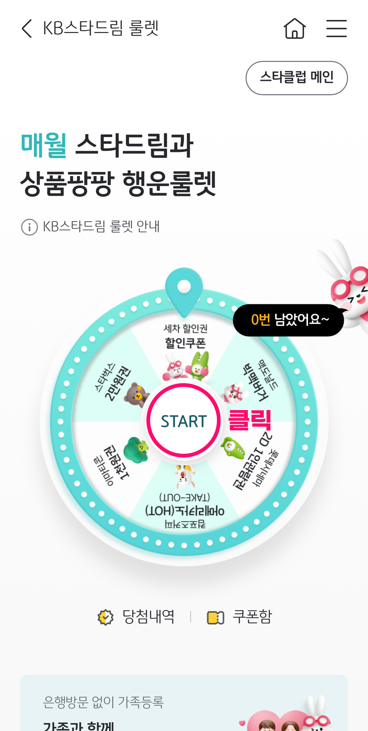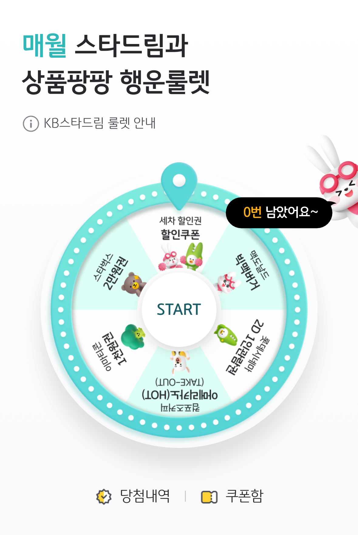 짜잔~ 행운룰렛에 참여할 수 있는 이벤트페이지가 나왔나요? 저는 이미 참여해서 0번 남았다고 나오는데요. 토끼가 몇 번 응모할 수 있는지 알려준답니다. 룰렛 가운데 START 버튼을 클릭해서 룰렛을 돌린 후 잠시 기다리면 두근두근두근~ 당첨!!!! 당첨된 경품은 쿠폰함에서 확인할 수 있답니다~