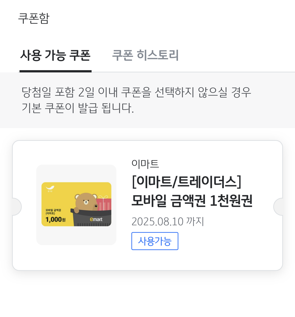 이번 달 경품은 세차할인쿠폰, 빅맥버거, 롯데시네마관람권, 컴포즈커피 아메리카노, 이마티콘 1천 원, 스타벅스 2만 원권입니다. 경품은 매달 조금씩 구성이 달라지지만 크게 부담 없으면서도 실용적인 상품들로 구성되어 있습니다. 이번 달에는 이마티콘이 당첨되었는데요. 그동안 이마티콘, 아메리카노쿠폰, 다이소 1만 원 권에 당첨되어 알차게 잘 사용했답니다. 경품이 소소한 만큼 기대 부담도 적고 당첨되면 기분이 좋아지는 매력이 있는데요. 세차 할인쿠폰은 꽝..이나 다름없지만 거의 당첨되지는 않았답니다.