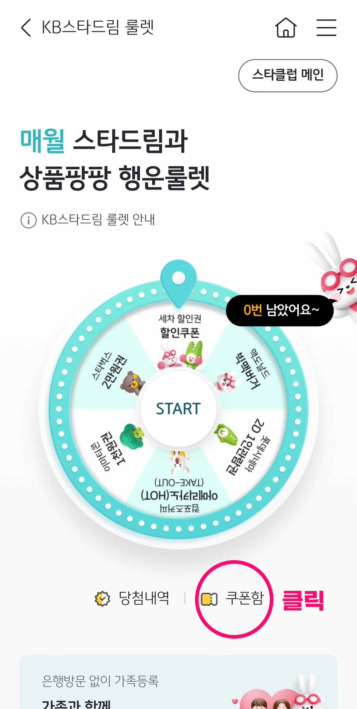 짜잔~ 행운룰렛에 참여할 수 있는 이벤트페이지가 나왔나요? 저는 이미 참여해서 0번 남았다고 나오는데요. 토끼가 몇 번 응모할 수 있는지 알려준답니다. 룰렛 가운데 START 버튼을 클릭해서 룰렛을 돌린 후 잠시 기다리면 두근두근두근~ 당첨!!!! 당첨된 경품은 쿠폰함에서 확인할 수 있답니다~