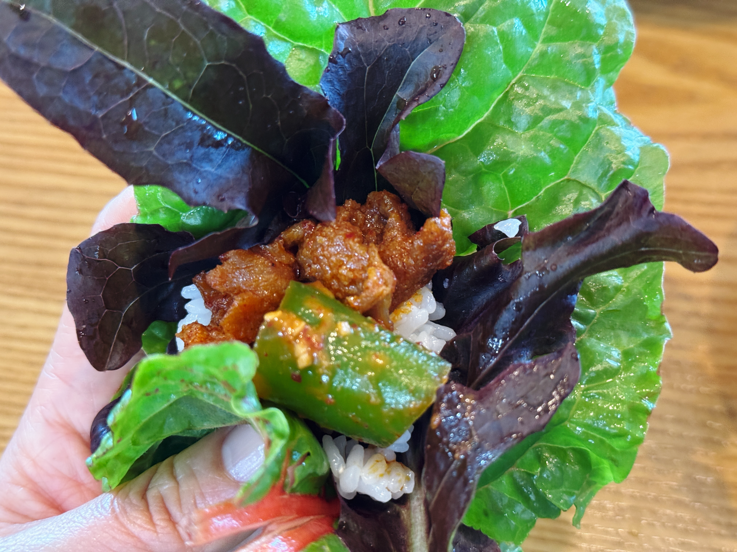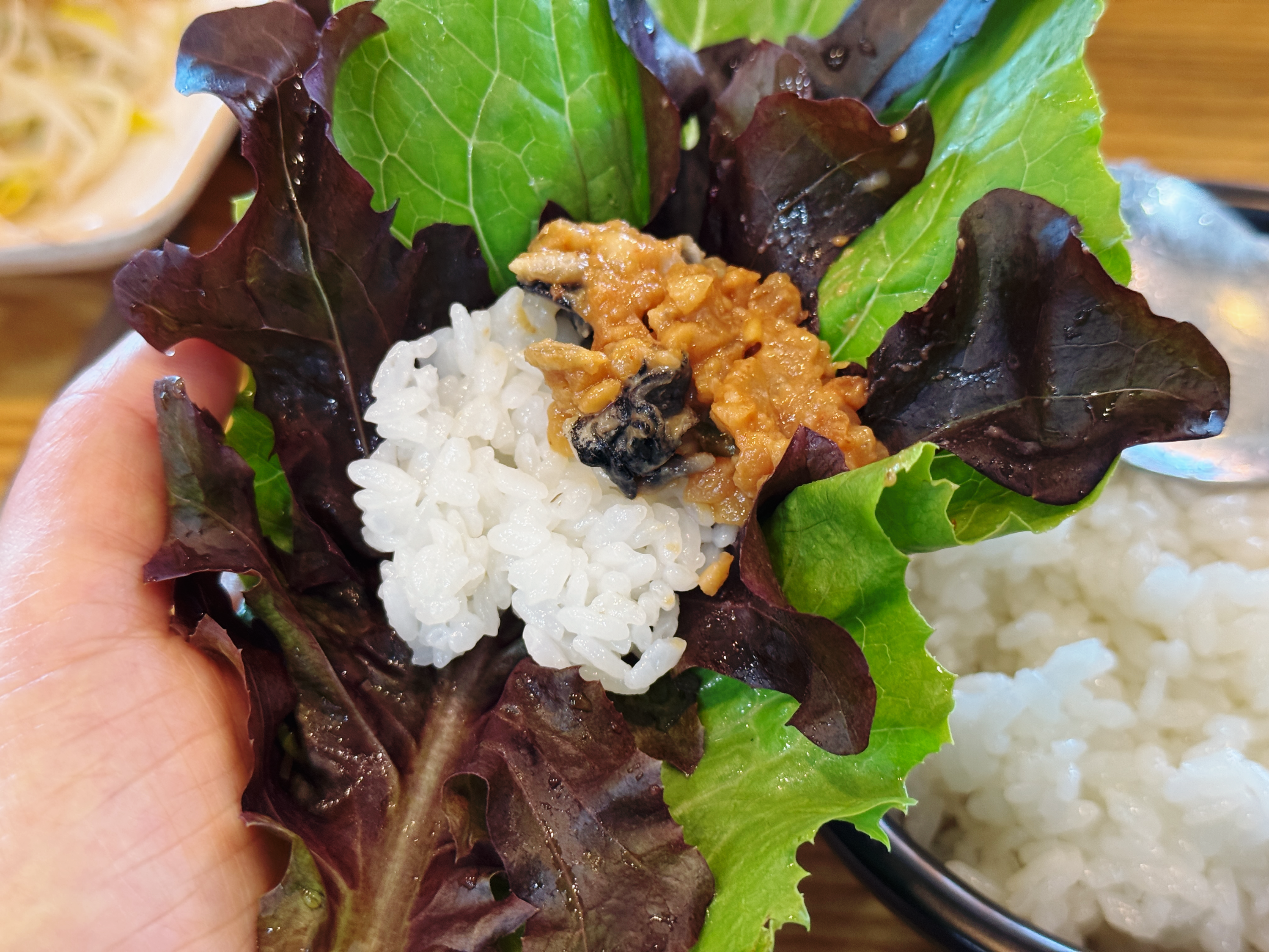 다양한 쌈채소에 제육볶음, 멸치조림, 우렁쌈장, 갈치속젓까지~ 야무지게 싸 먹었답니다. 배가 불러 제육볶음 리필을 하고 싶었는데 할 수가 없었.. 습니다. 쌈만 싸 먹어도 배가 부르다니.. 쌈을 좀 많이 싸 먹긴 했네요 :-)