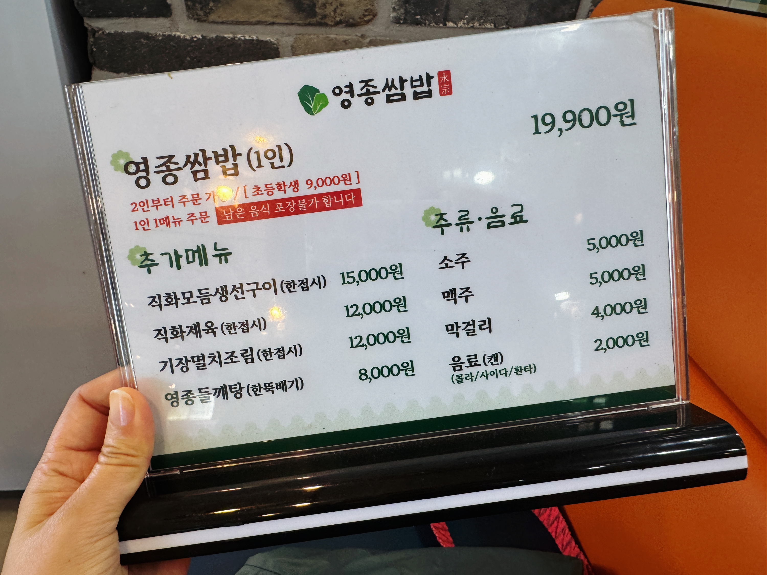영종쌈밥의 메뉴는 쌈밥 한 가지인데요. 2인부터 주문이 가능하고 생선구이, 제육, 멸치조림, 들깨탕을 추가로 주문할 수 있습니다. 추가메뉴 중에서 제육과 멸치조림, 들깨탕은 기본으로 나오기 때문에 생선구이가 드시고 싶으시면 생선구이만 추가하시면 됩니다~