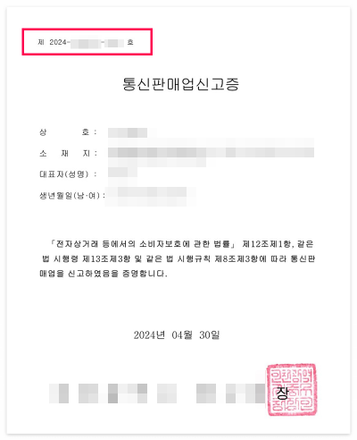 통신판매업신고증 왼쪽 상단의 제2024 - 지역 - 0000호 이부분이 통신판매업신고번호입니다.