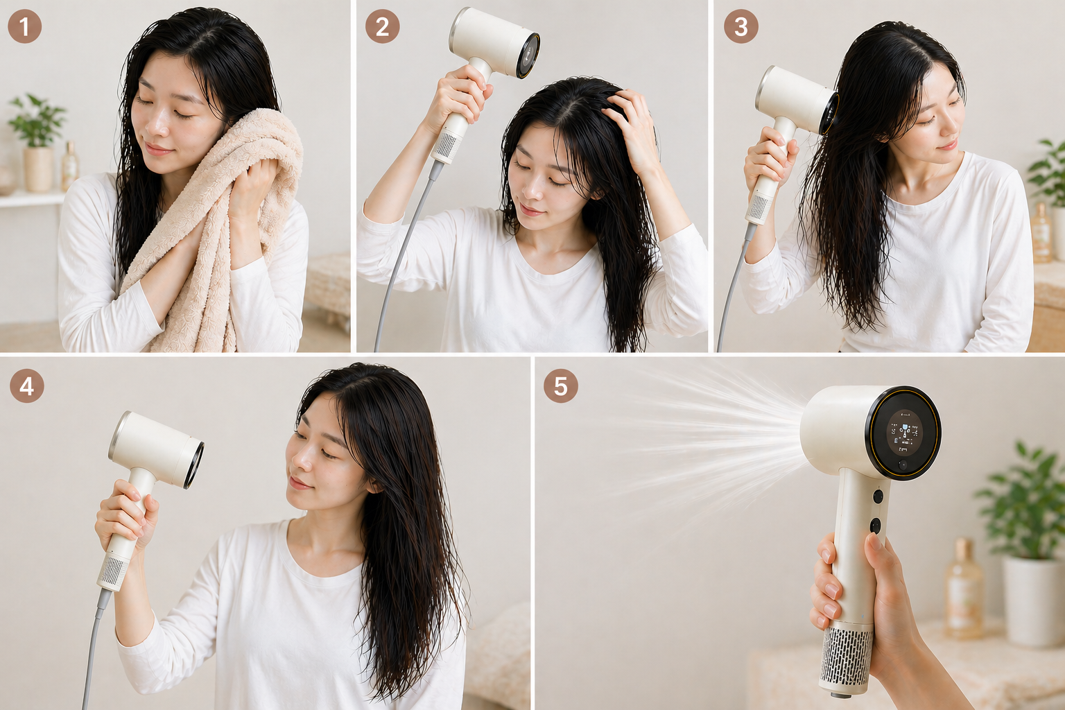 ![]() 1. 수건 사용 2. 두피 먼저 건조 3. 말리는 요령 4. 적절한 거리 5. 드라이기 |
