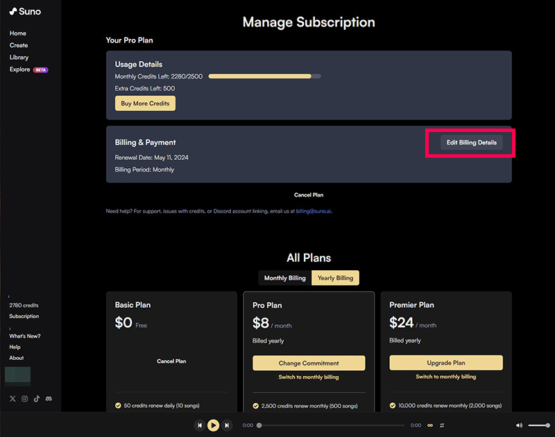 Billing & Payment에서 Edit Billing Details 버튼을 클릭해 주세요.