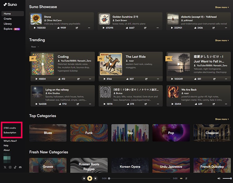 수노에 접속해서 로그인을 하고 왼쪽 하단 Subscription을 클릭해 주세요.