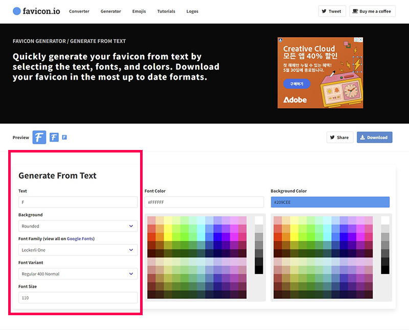 Generate From Text에서 텍스트, 파비콘 모양, 폰트, 폰트 두께, 폰트 크기, 폰트 색상, 파비콘 색상 등을 원하는 대로 설정해서 파비콘을 만들 수 있습니다.