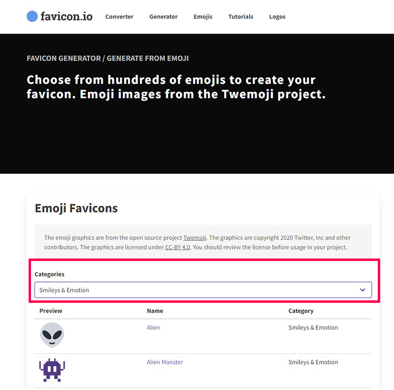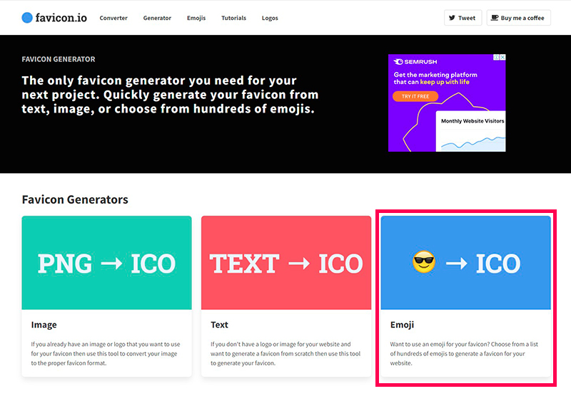 Favicon Generators에서 Emoji > ICO라고 되어 있는 부분을 클릭해 주세요.