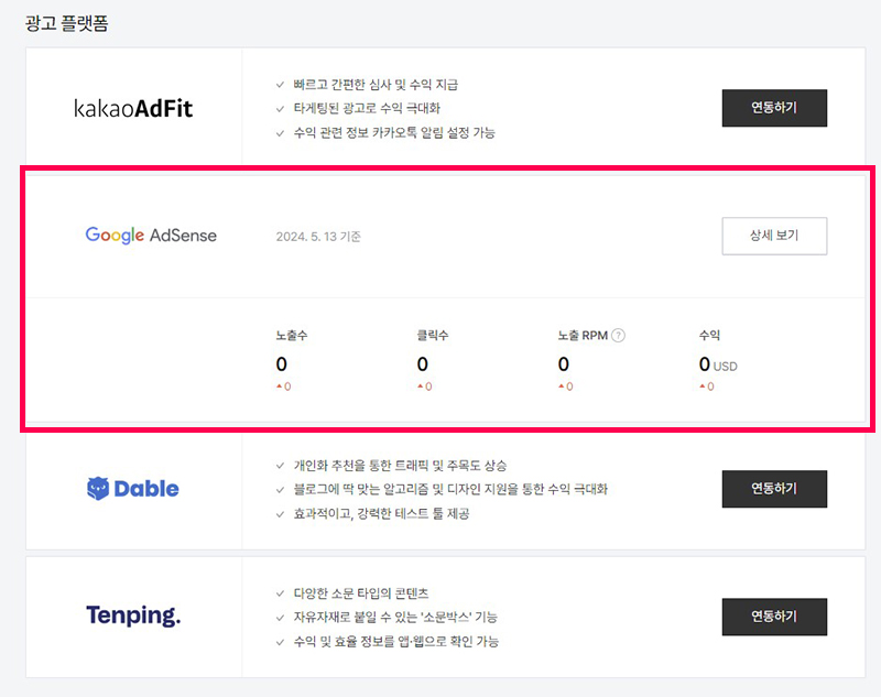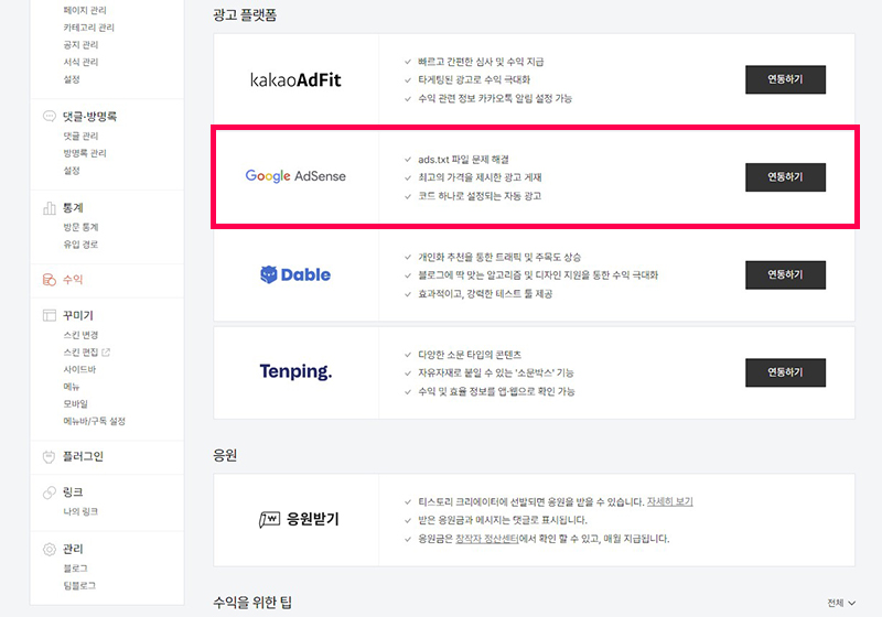 광고 플랫폼 중 구글애드센스 연동하기 버튼을 클릭해 주세요.