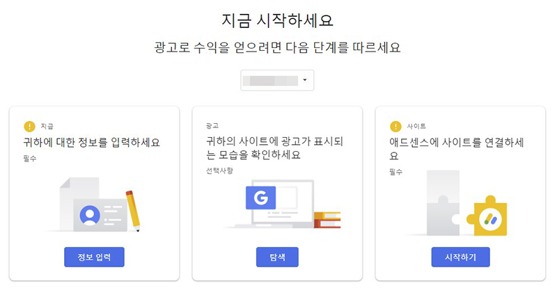 이제 다시 애드센스로 돌아가 세 번째 사이트 연결 배너 시작하기 버튼을 클릭해 주세요.