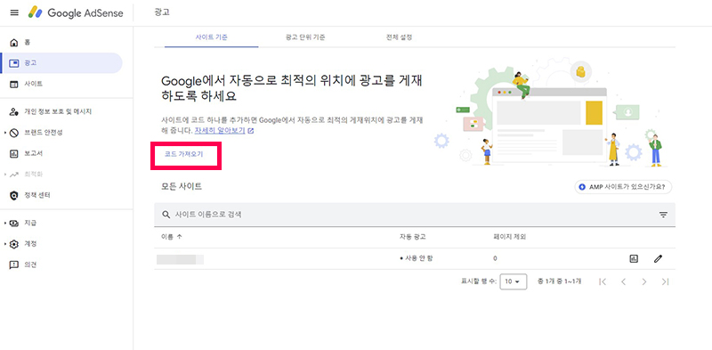 코드는 애드센스 좌측 메뉴 광고에서 확인할 수 있습니다.