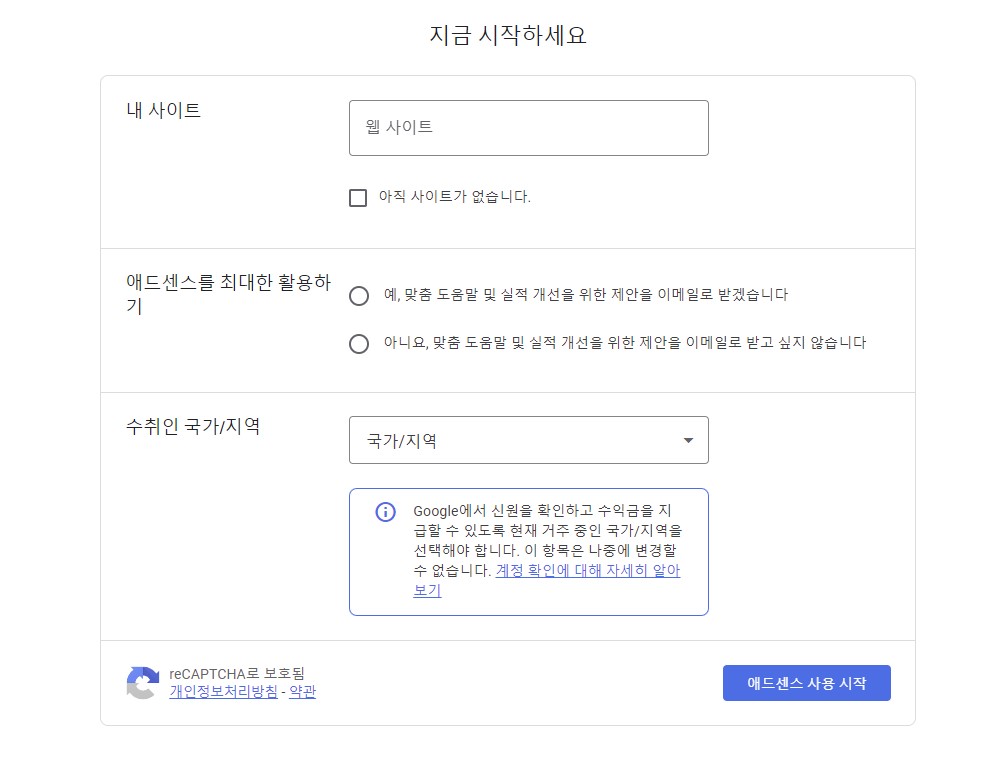 애드센스에 등록할 사이트 주소와 애드센스 활용하기, 국가/지역 선택 후 애드센스 사용 시작 버튼을 눌러 주세요.