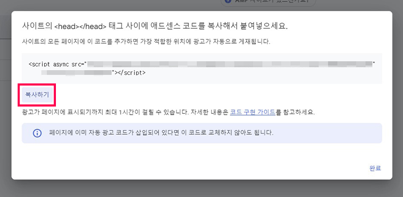 우선 애드센스 사이트에서 코드를 복사해 티스토리 html에 붙여 넣기를 해야 합니다.