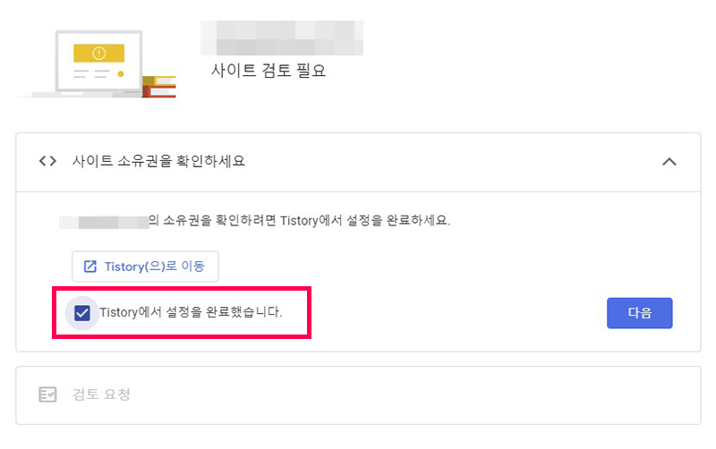 시작하기 버튼을 클릭하면 나오는 화면에서 티스토리 설정 완료를 체크하고 다음 버튼을 눌러주세요~