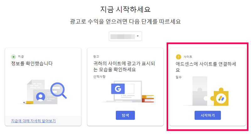 이제 다시 애드센스로 돌아가 세 번째 사이트 연결 배너 시작하기 버튼을 클릭해 주세요.