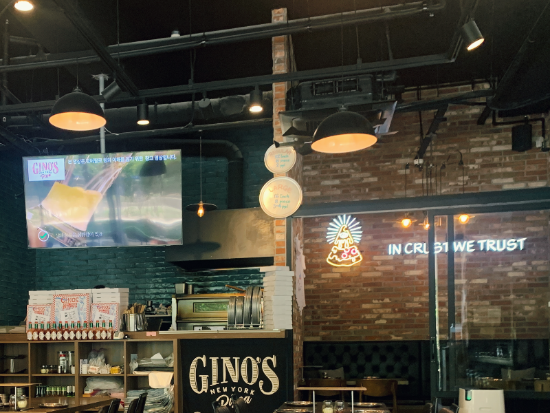 매장 한쪽 파랗게 페인팅한 벽면 위에 지노스 피자 로고가 커다랗게 써져 있는 것이 인상적이었는데요. 왠지 뉴욕의 힙한 골목 어느 식당에 온 듯한 느낌이 들었답니다.