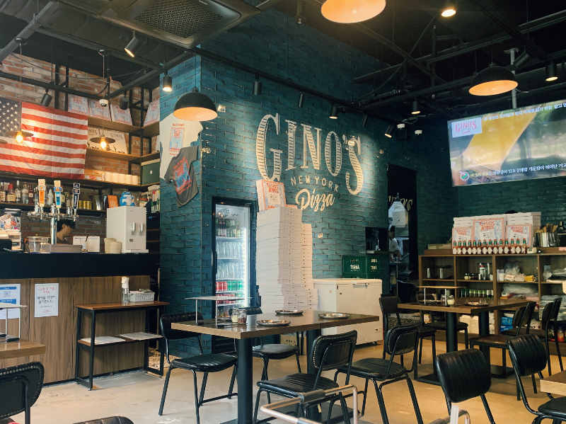 매장 한쪽 파랗게 페인팅한 벽면 위에 지노스 피자 로고가 커다랗게 써져 있는 것이 인상적이었는데요. 왠지 뉴욕의 힙한 골목 어느 식당에 온 듯한 느낌이 들었답니다.