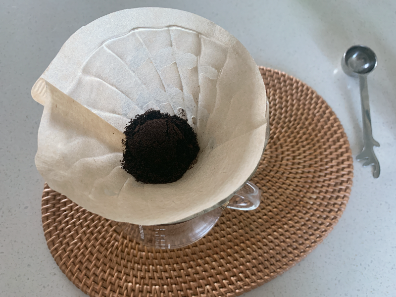 저는 1스푼이 6-7g 정도 되는 원두 스푼으로 2스푼을 종이필터에 넣고 500~550ml 정도 물을 부어 내려서 마십니다.