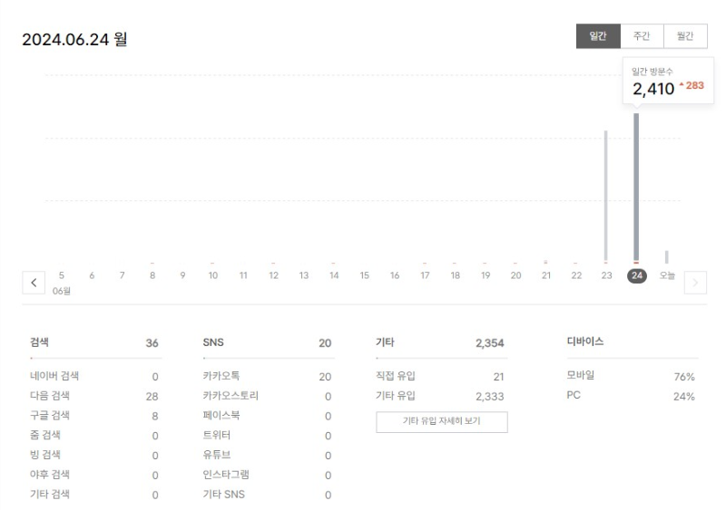 6월 23일과 24일의 일간 방문수입니다. 전날 대비 2085명 증가라니.. 비현실적입니다~ 22일 이전은 일간 방문수 막대가 그냥 점으로 보이네요 >.< 기타 유입에 2000명 이상이 표시되어 있습니다. 그 기타 유입이 바로~ 다음입니다!