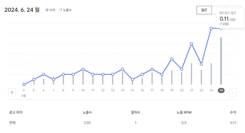 방문수가 급증하면 애드센스 수익도 증가하는지 확인해 보았는데 노출수만 높을 뿐 수익은 0.11 증가했답니다. 0.11 USD라니.. 150원 정도 되나 봅니다~ 살짝 실망했지만 기타 유입 방문수 급증이 아닌 높은 방문수가 항상 유지되는 블로그가 되어야겠다고 다짐했답니다.