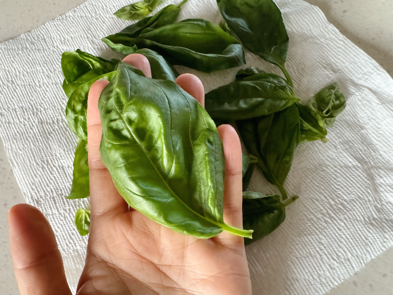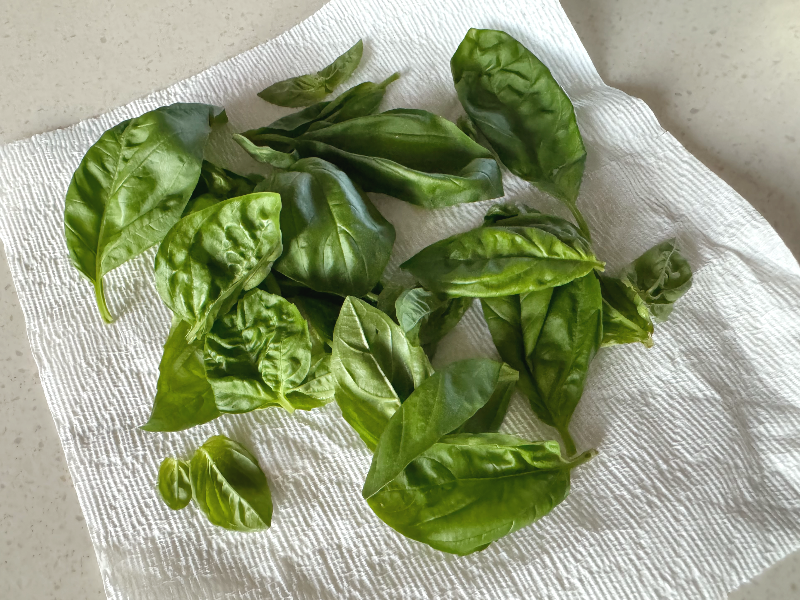 바질은 깨끗하게 씻어 물기를 말려 주세요. 바질향이 많이 나는 걸 좋아하시면 잎을 잘라서 넣으시면 됩니다. 전 잎 모양이 그대로인 것이 좋아 자르지 않고 그대로 사용했습니다.